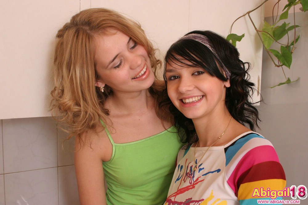 Cute teen chick Abigail 18 and her blonde friend make out passionately and kiss.