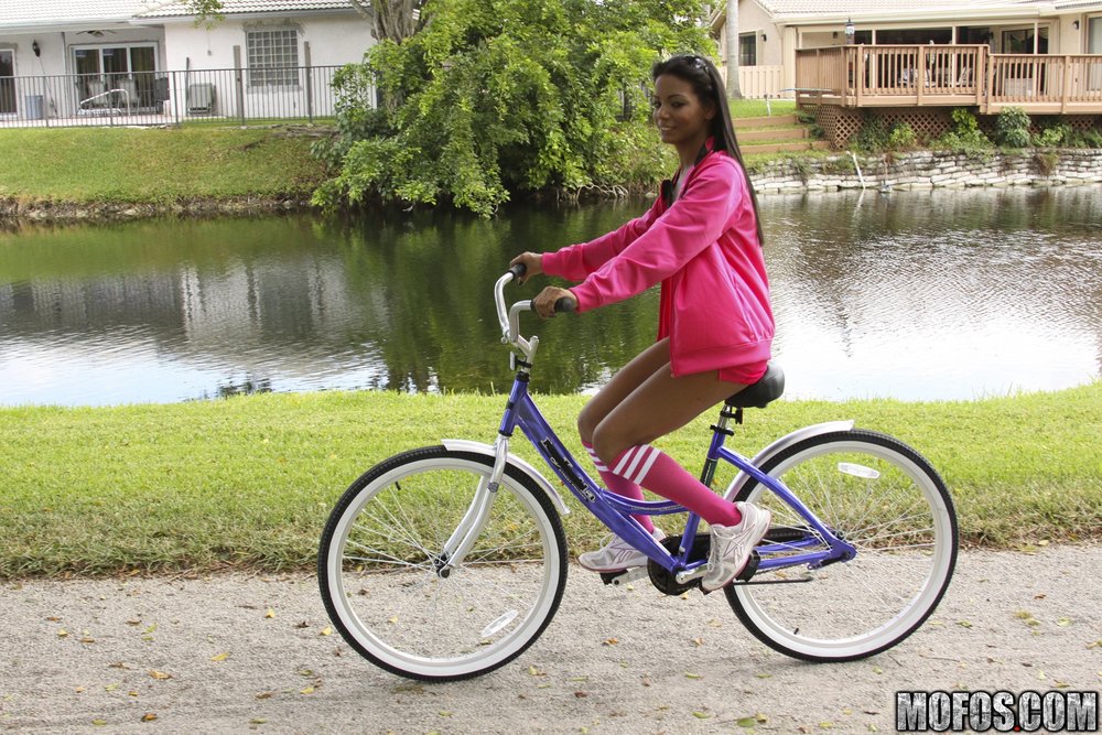 Adrianna Milano takes her sexy pink lingerie outdoors and shows us her big black tits.