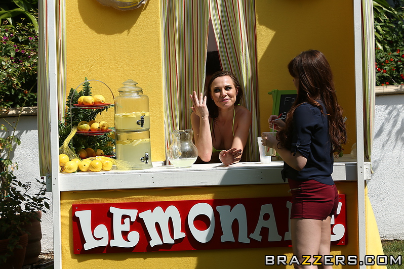 Gorgeous brunette babe with big boobs sells lemonade and serves a dude with her pussy at once