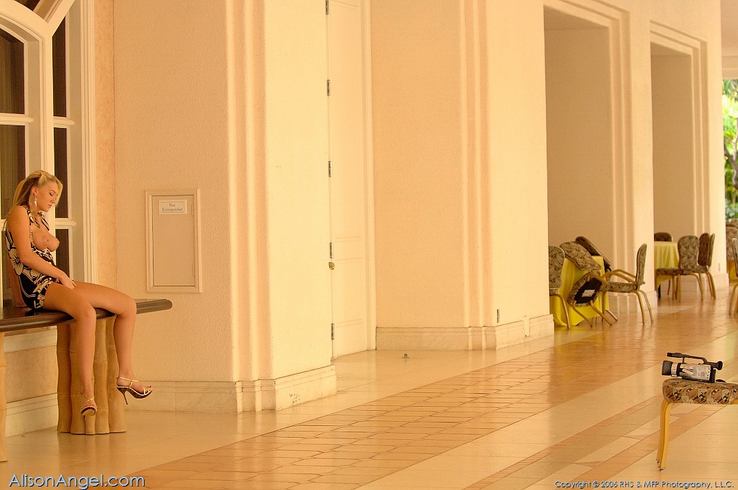 Cute blond girl, Alison Angel pulls up her dress and shows her nasty pussy and tits.