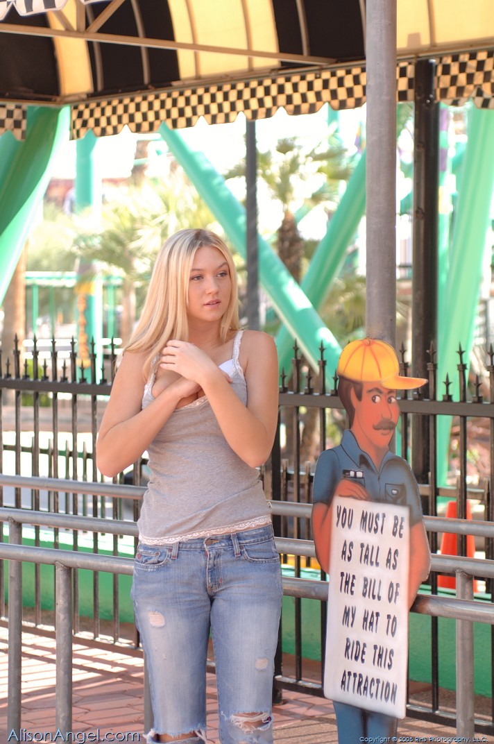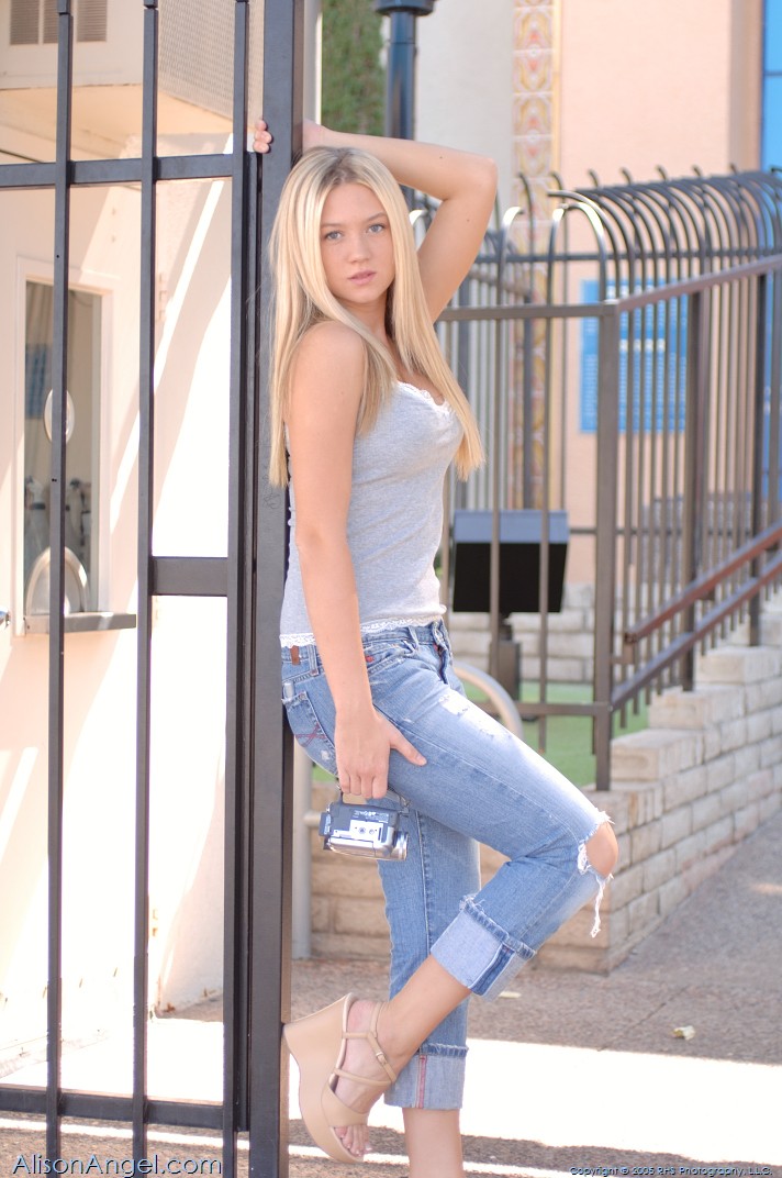 Cute and sexy blond solo babe, Alison Angel shows her white bras while posing.