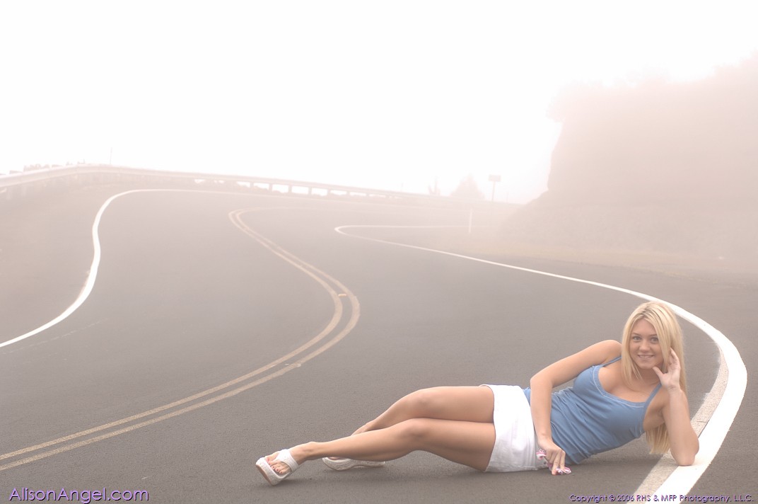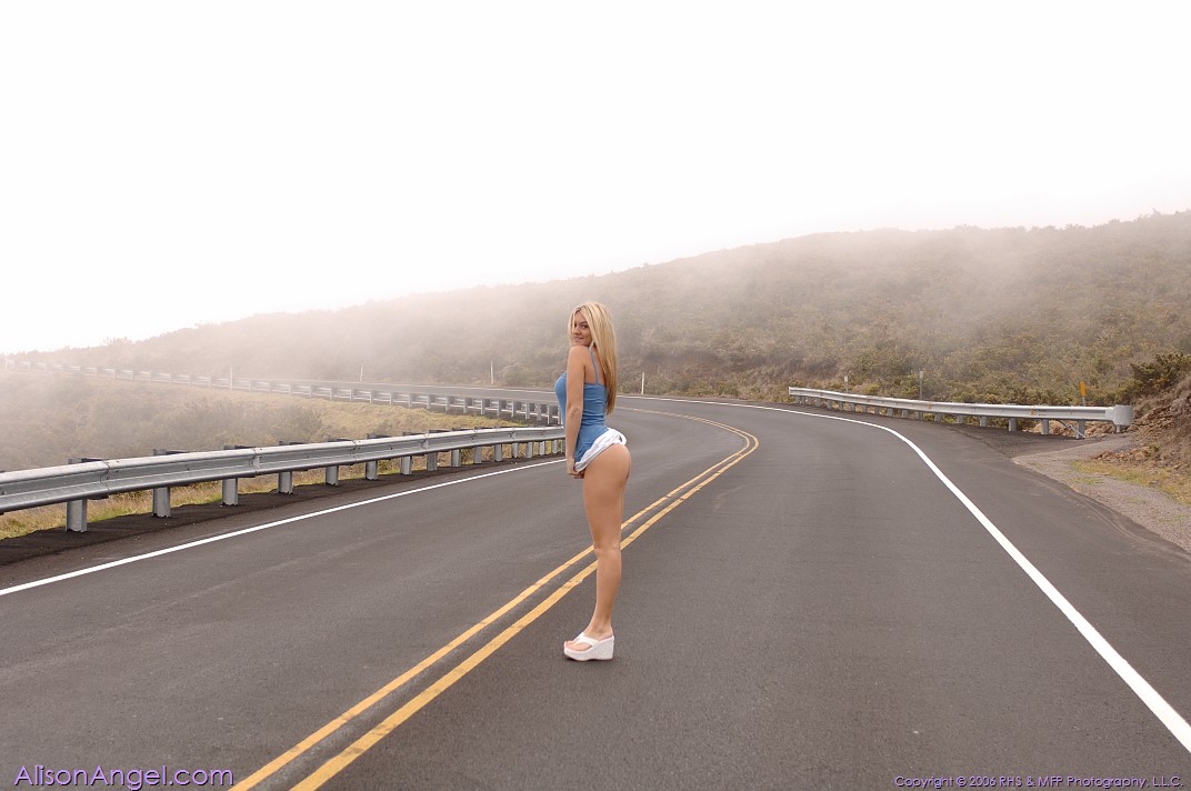 Alison Angel wakes up early to enjoy jogging and to flash her slit on the road.