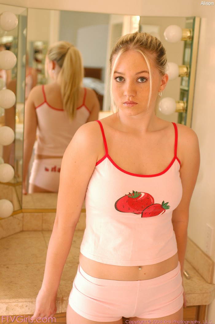 Beautiful blondie Alison Angel boasts about her hot feet, naked pussy and yummy tits.