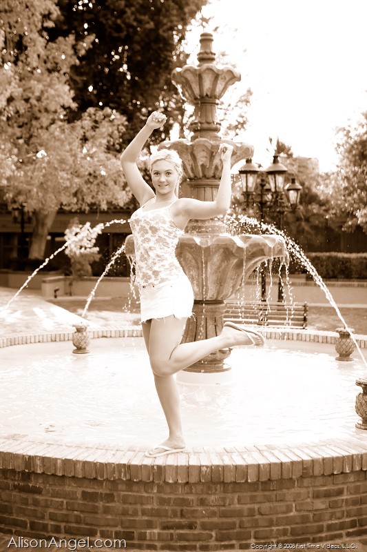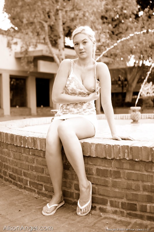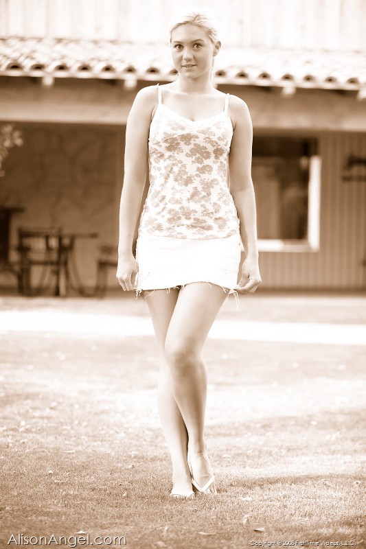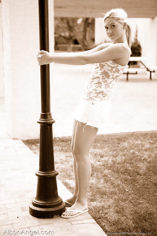Sweet and shy cutie, Alison Angel, wears no panties or bra when walking in a park.