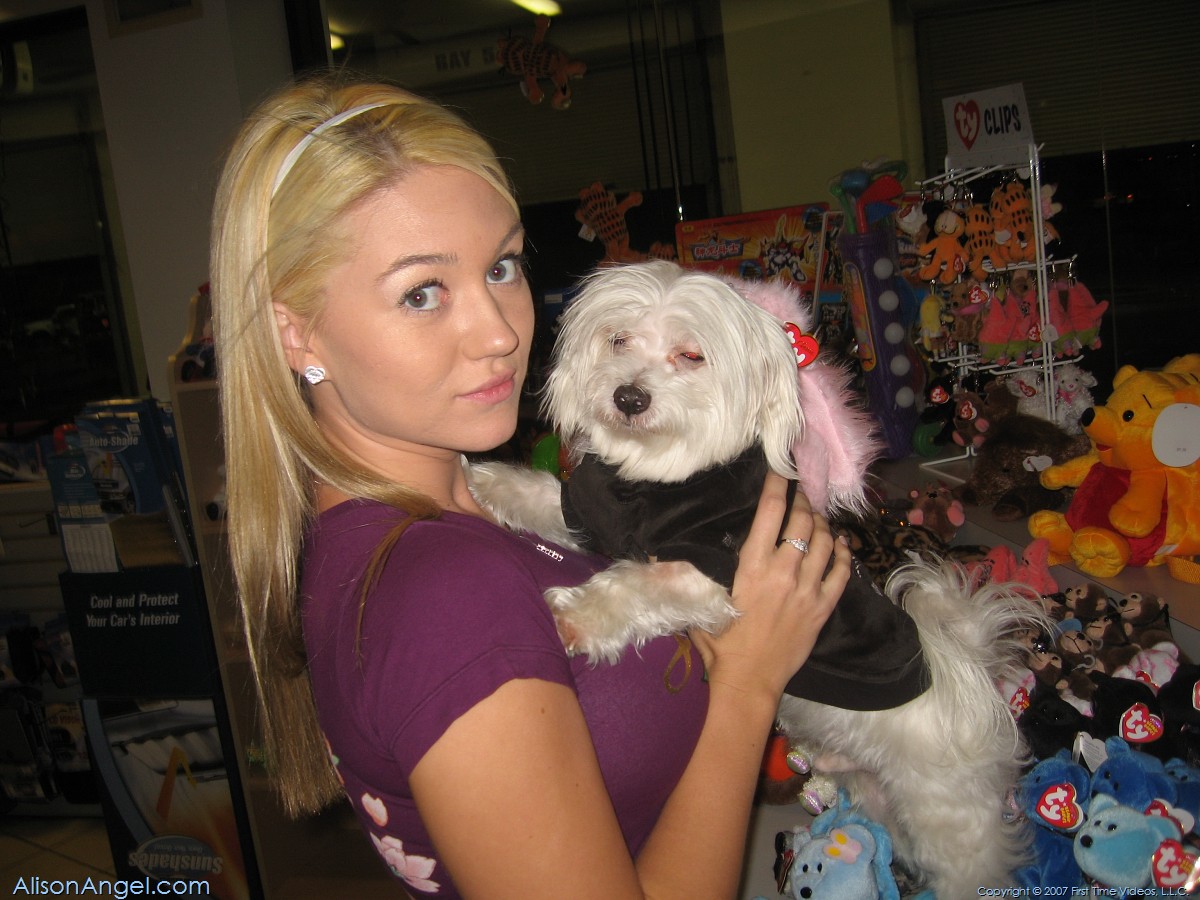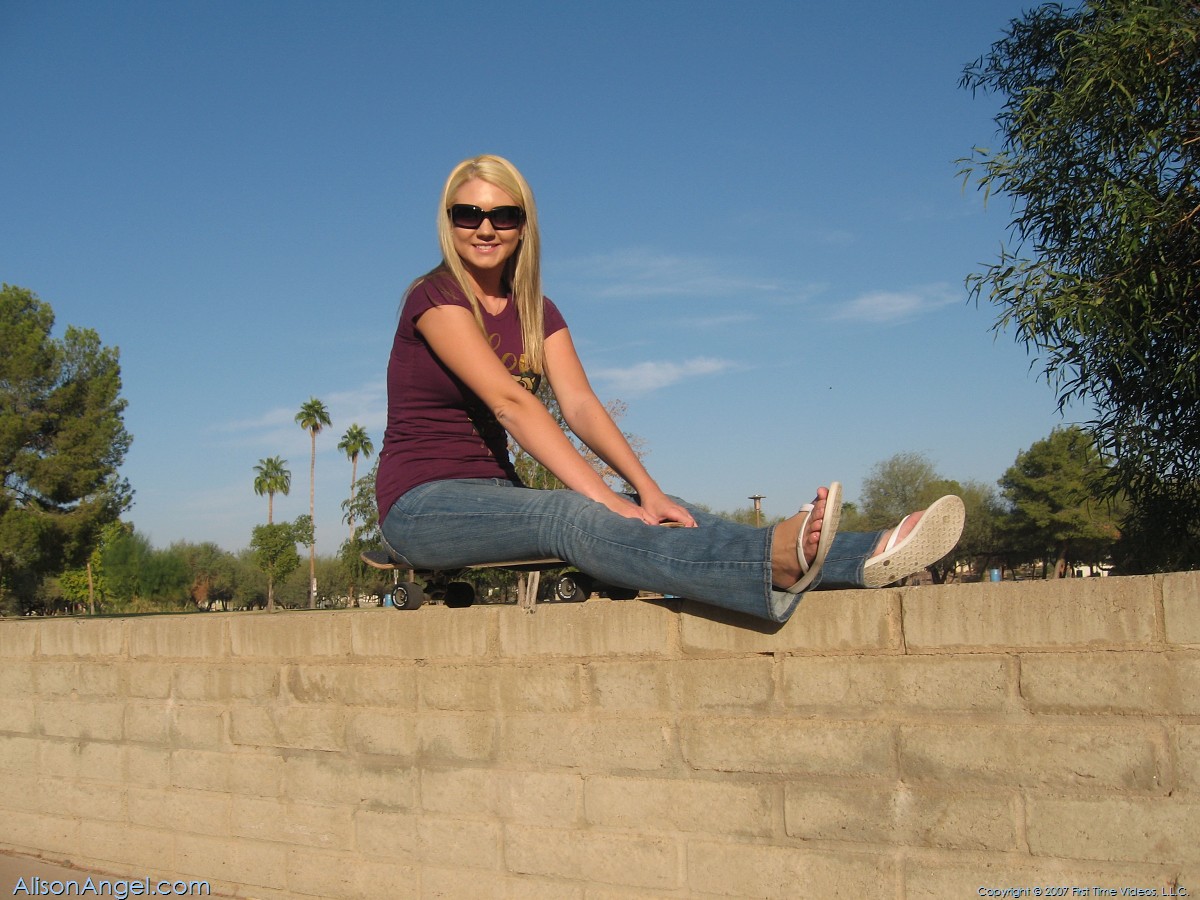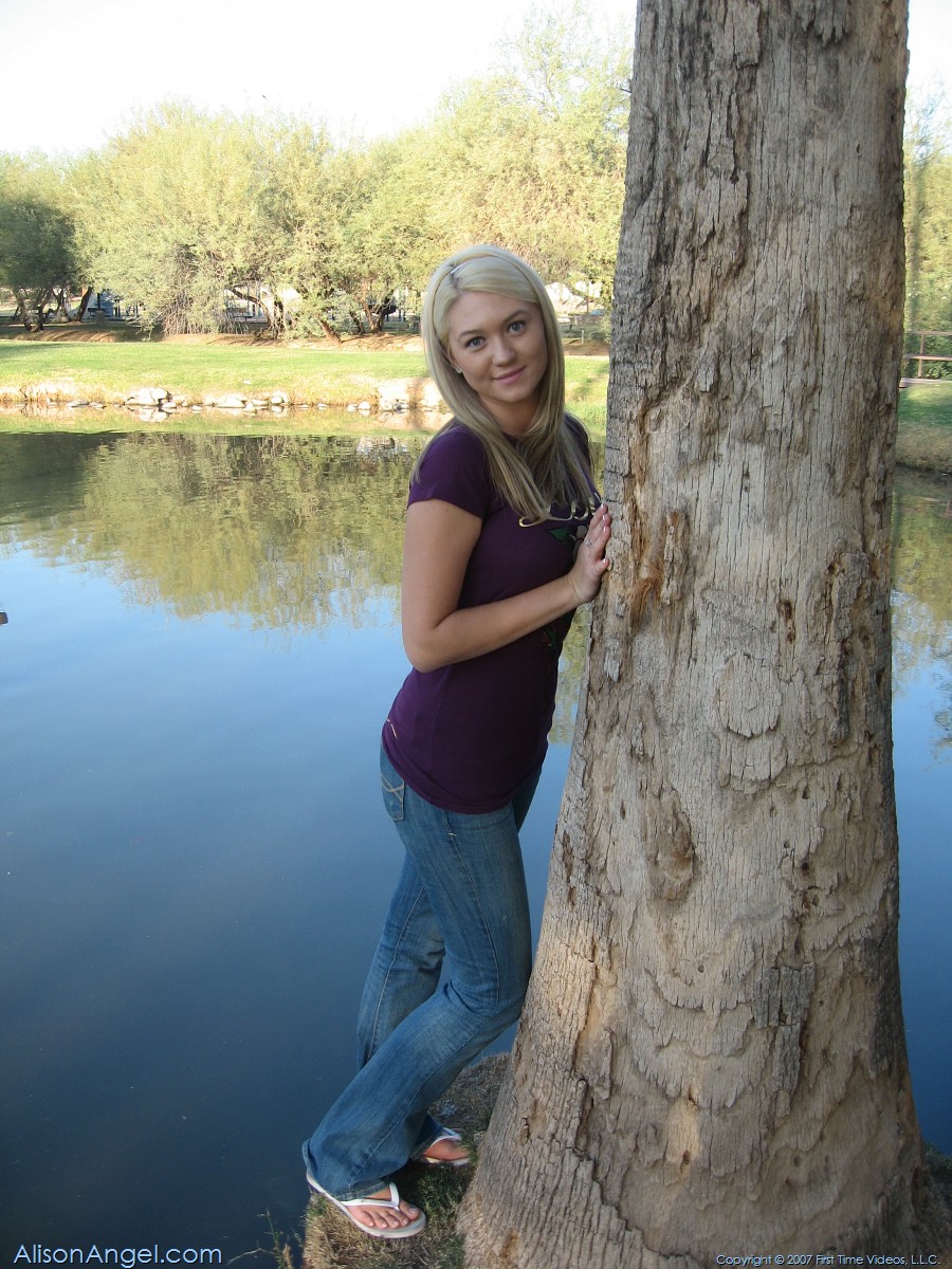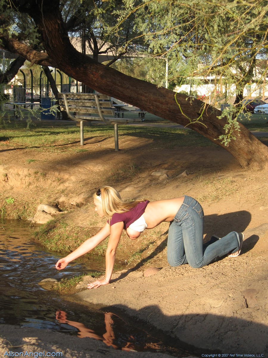 Beautiful cutie Alison Angel goes for a walk to flash her big tits and firm bottom.