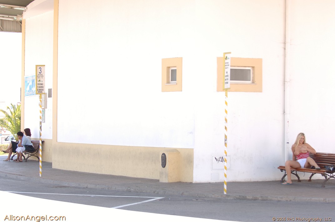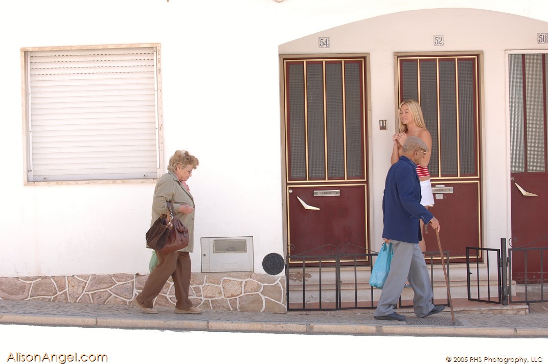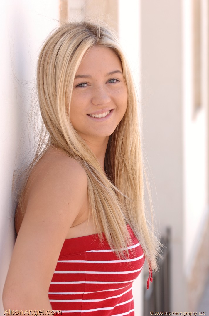 Alison Angel pulls off her cute red stripped shirt and shows her lickable titties.