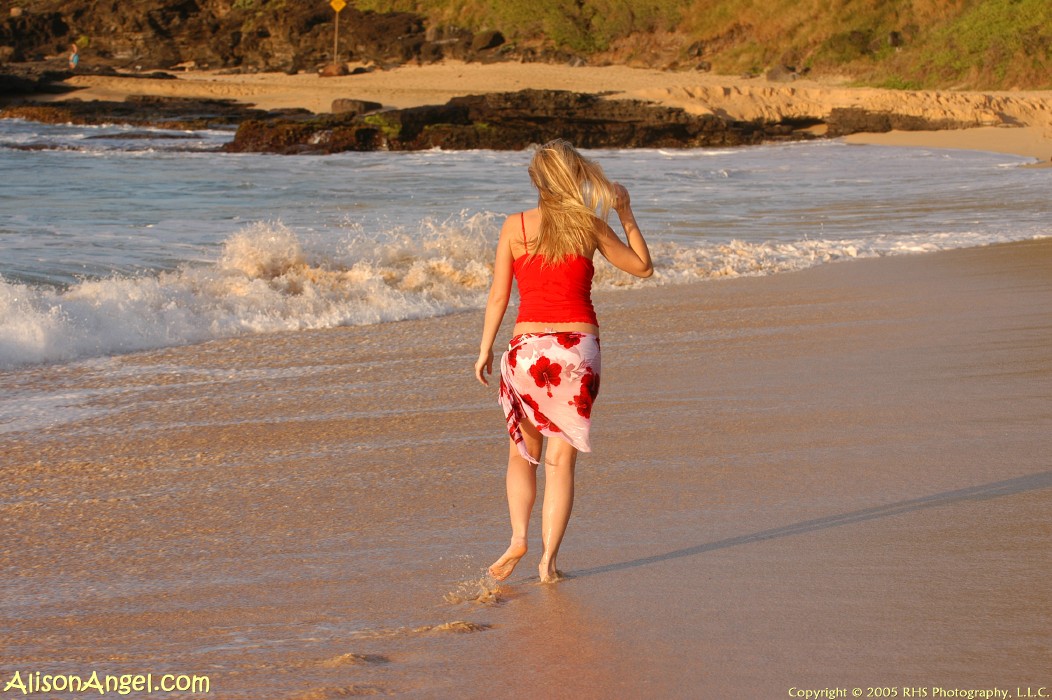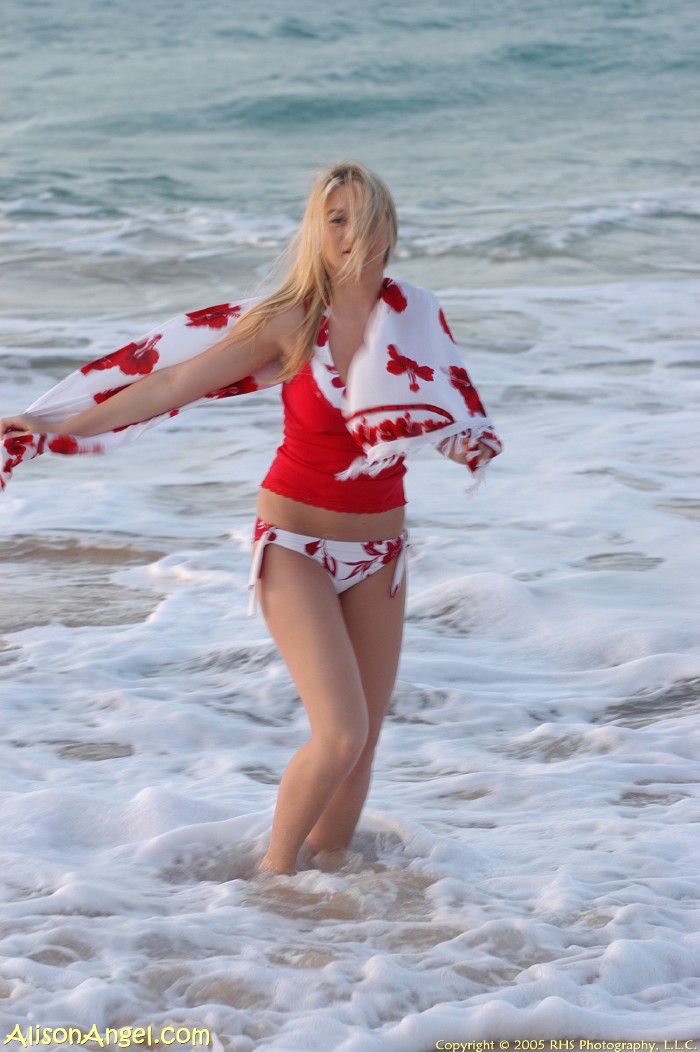 Alison Angel gets off her red shirt and shows boobs while posing on the beach.
