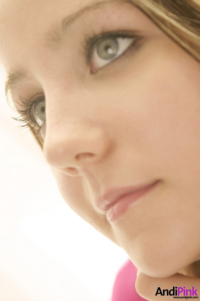 Cute teen gal Andi Pink takes off her blue lingerie and shows her curvy body.