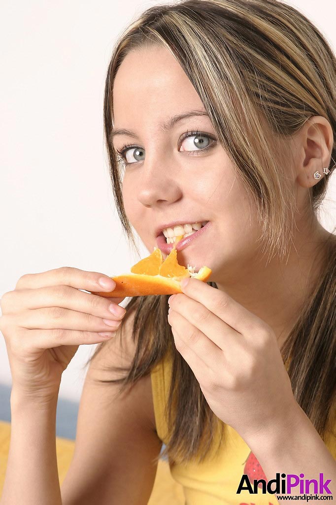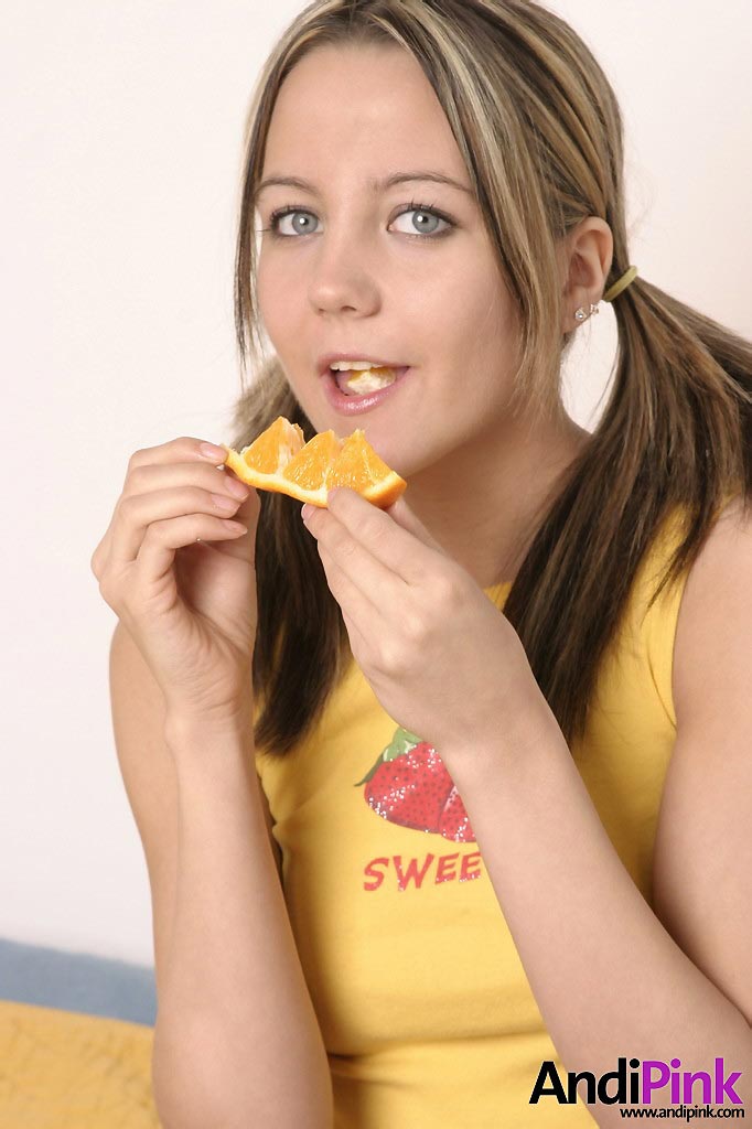 Lusty teen hottie Andi Pink eats fruits and slowly strips and teases with her boobs.