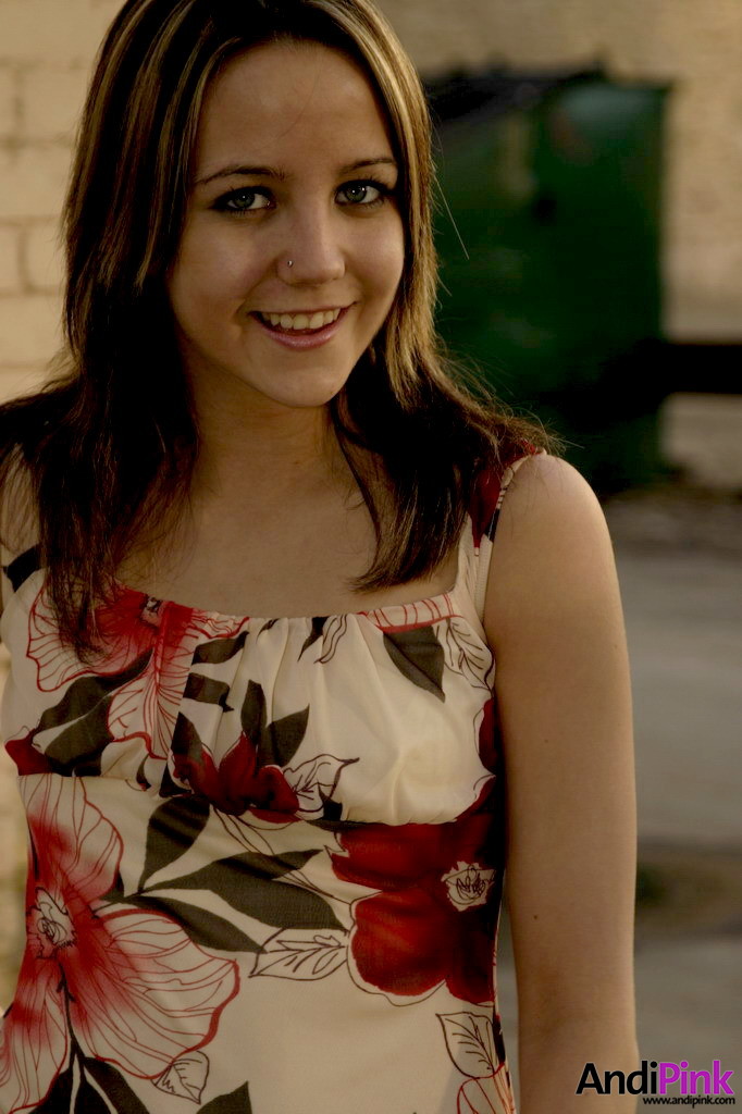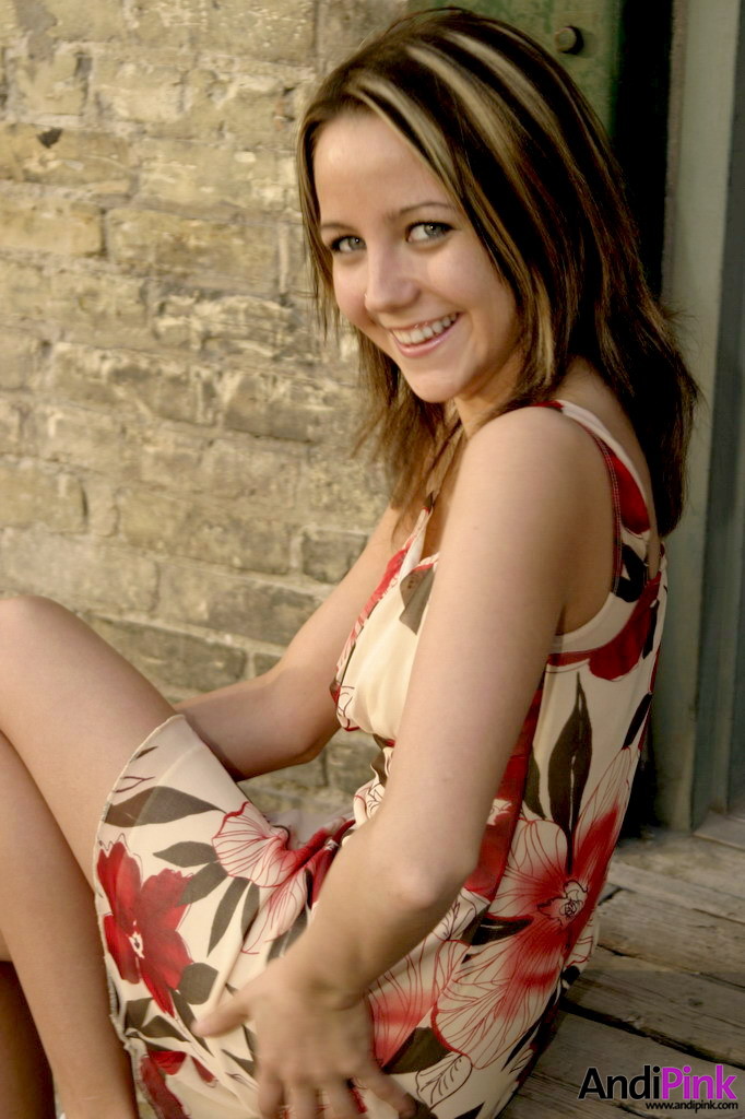 Cute teen gal Andi Pink takes off her pink dress and shows us her perky boobs.