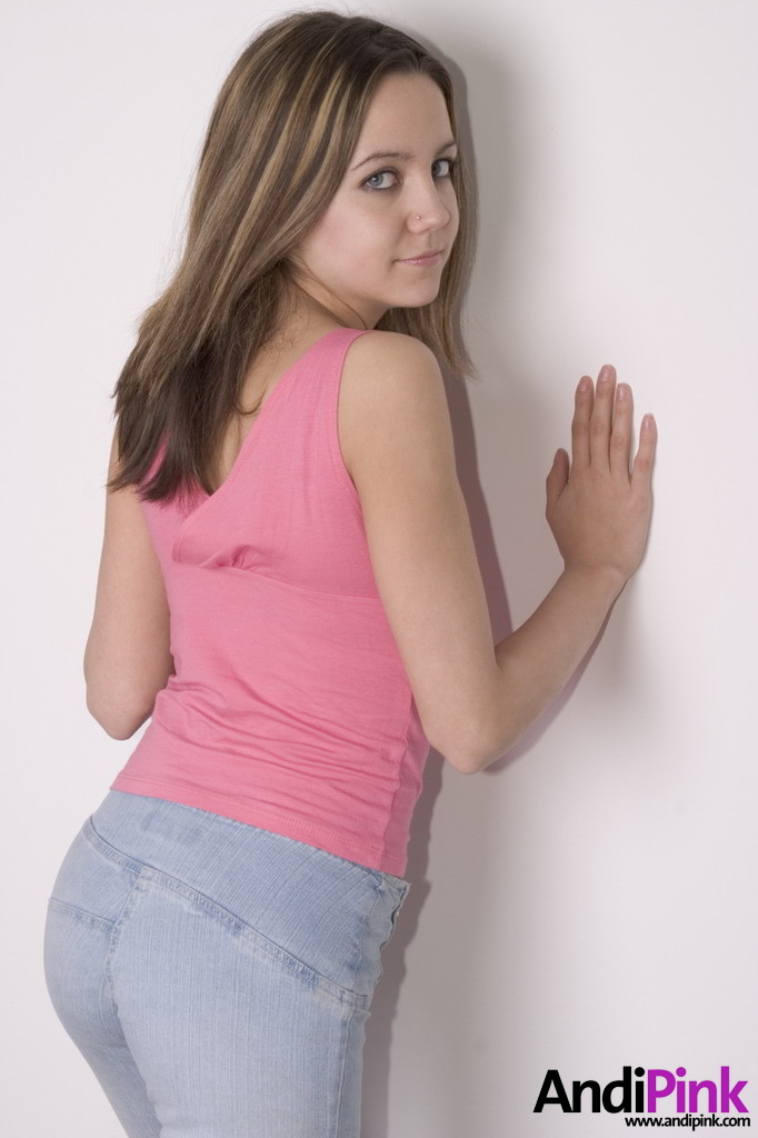 Hot blonde cuttie Andi Pink takes off her blue jeans and shows us her tight ass.