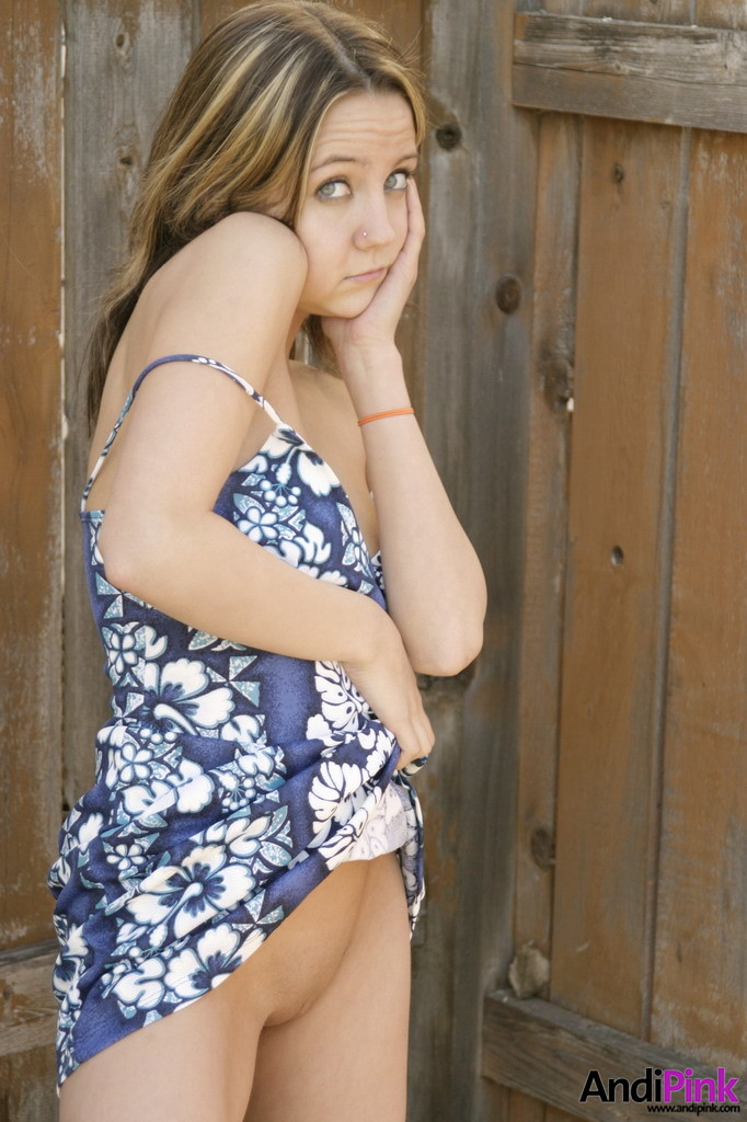 Hot teen bunny Andi Pink takes off her blue dress and shows her perky breasts.