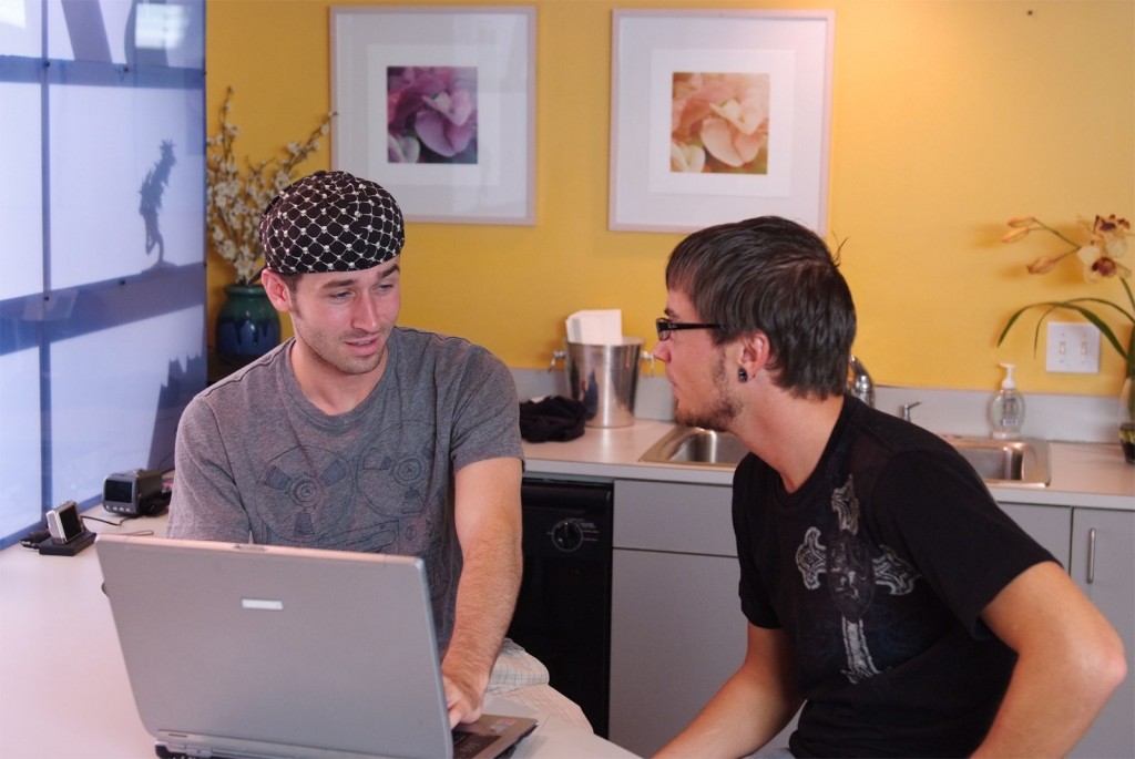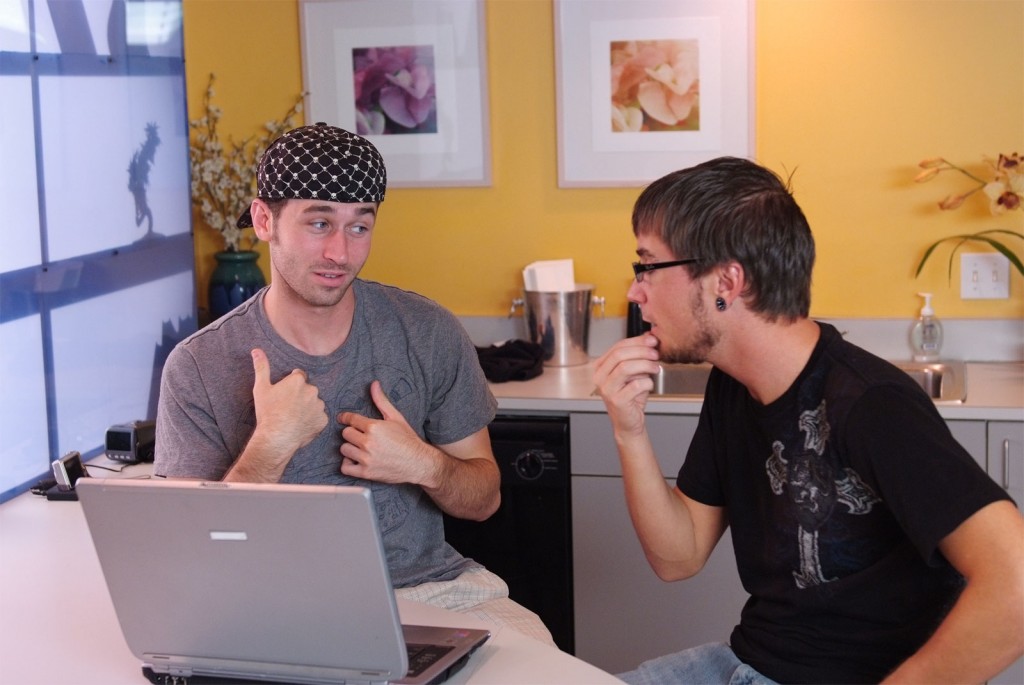 Angelina Valentine takes her slutty lingerie off and fucks with two hung nerdy studs.