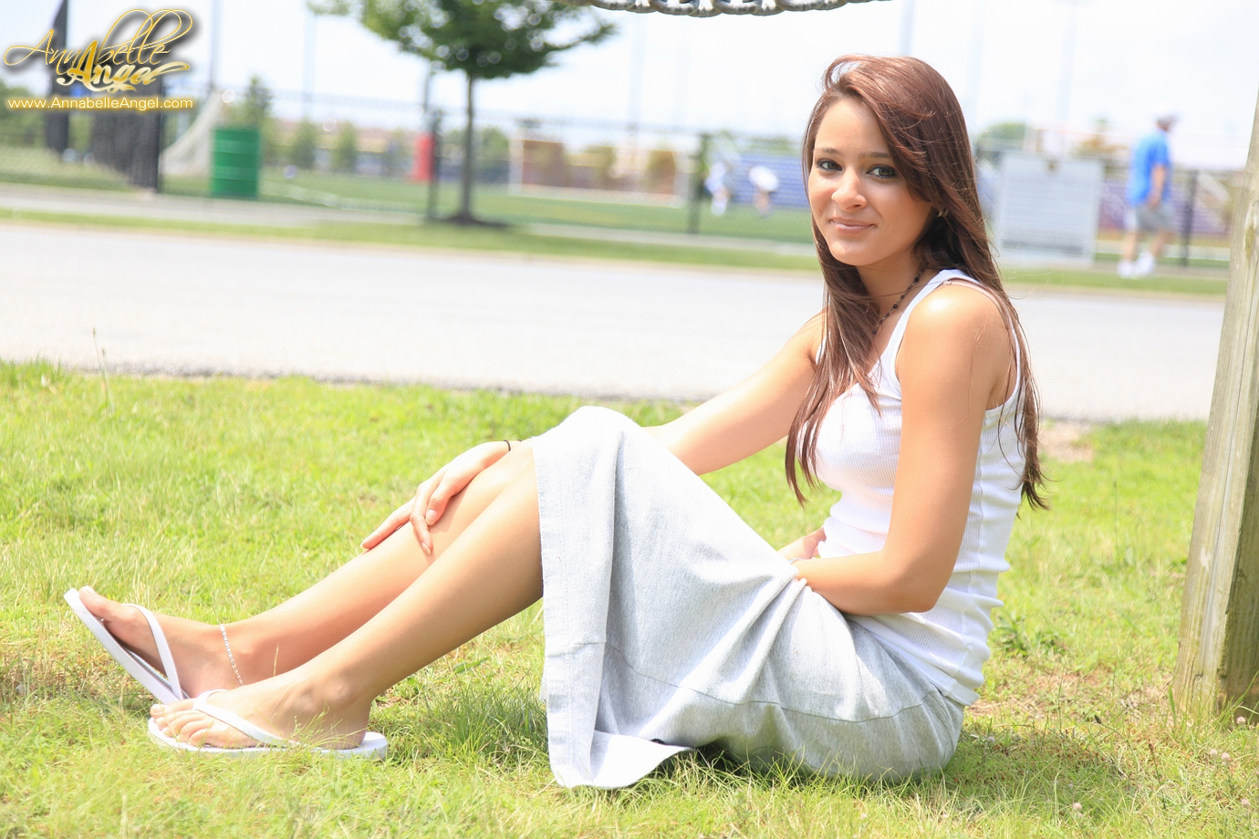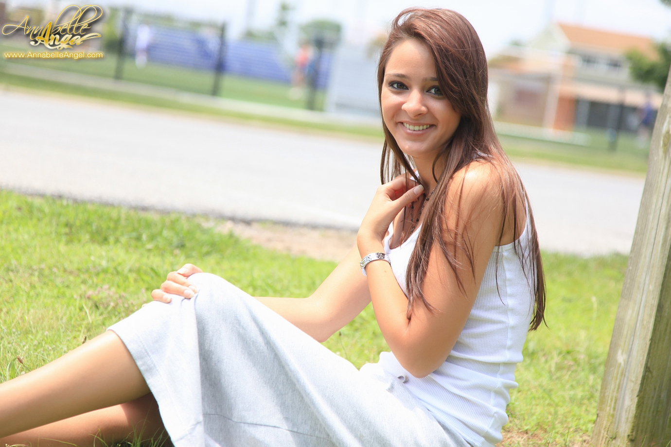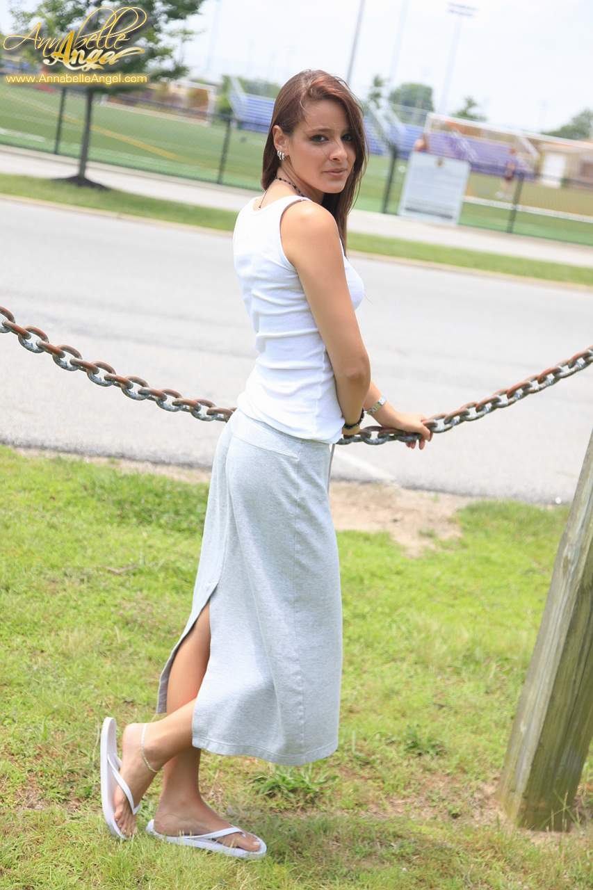 Annabelle Angel takes her sexy white dress outdoors and shows us her breasts.