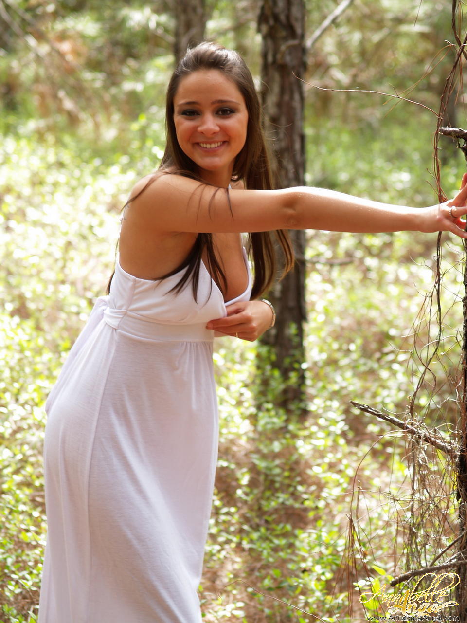 Annabelle Angel takes her sexy white see through dress in the woods and shows off.