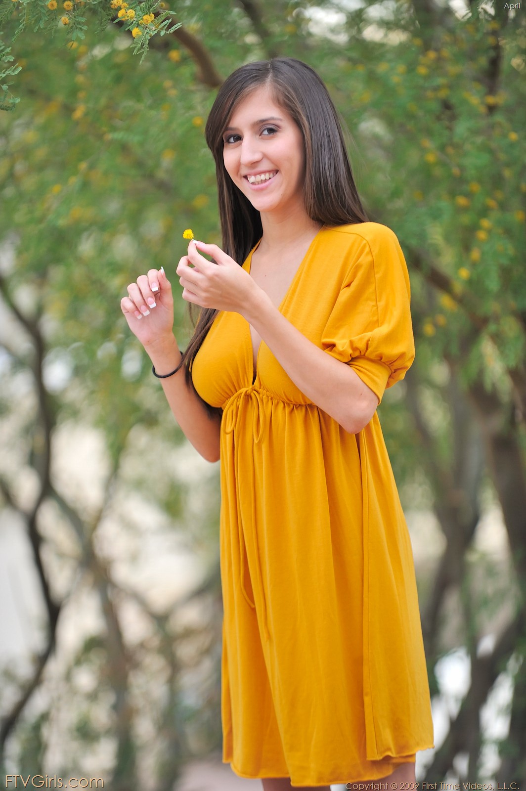April O'Neil posing in a long yellow dress and gets naked, showing her tits and ass.