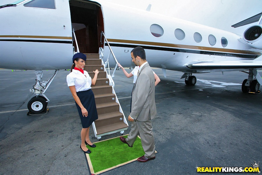Hot flight attendants Ariella Ferrera and Aimee Addison have sex with a rich dude.