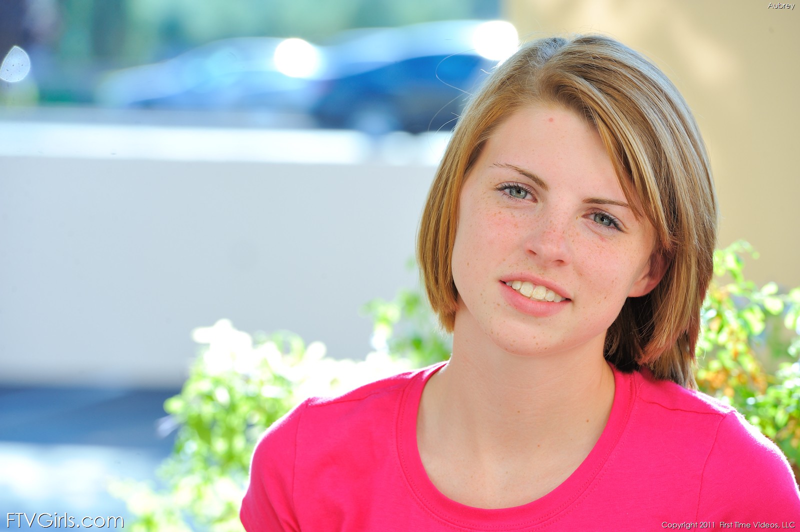 Aubrey Belle drops down her pink shirt and blue shorts and shows her naked body.