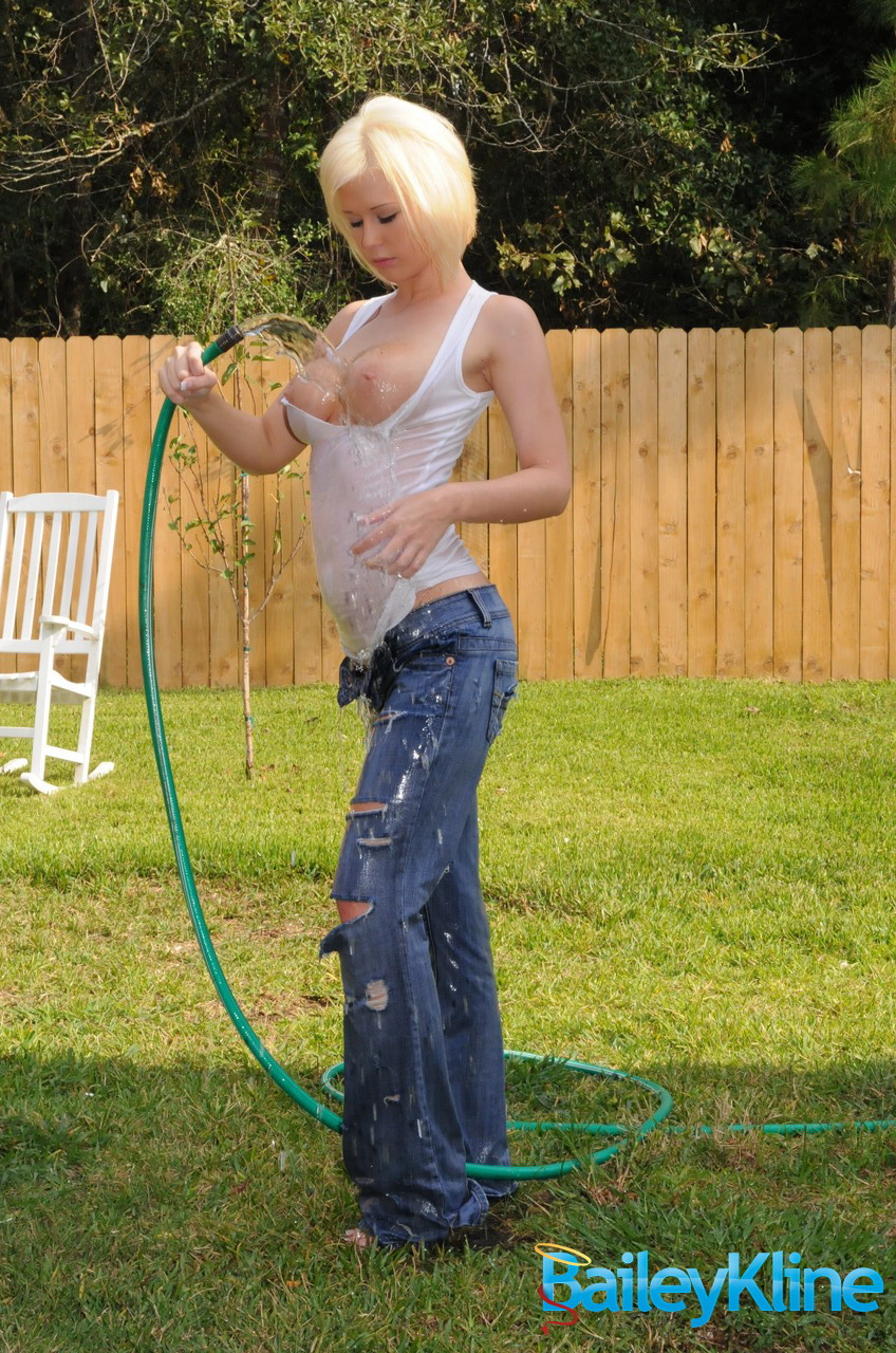 Smoking hot blonde chick Bailey Kline takes off her blue jeans and shows her ass.