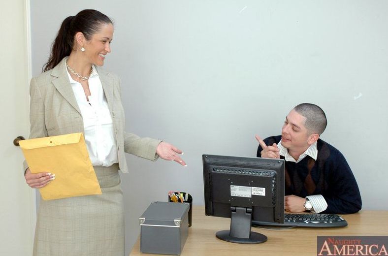Busty secretary Carmella Bing getting her shaved wet pussy shagged in the office.