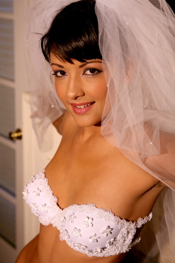 Slutty brunette bride Carmen Hart strips her bridal lingerie and shows her huge ass.
