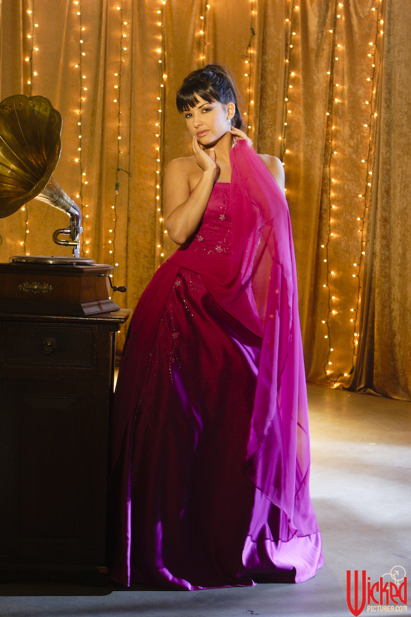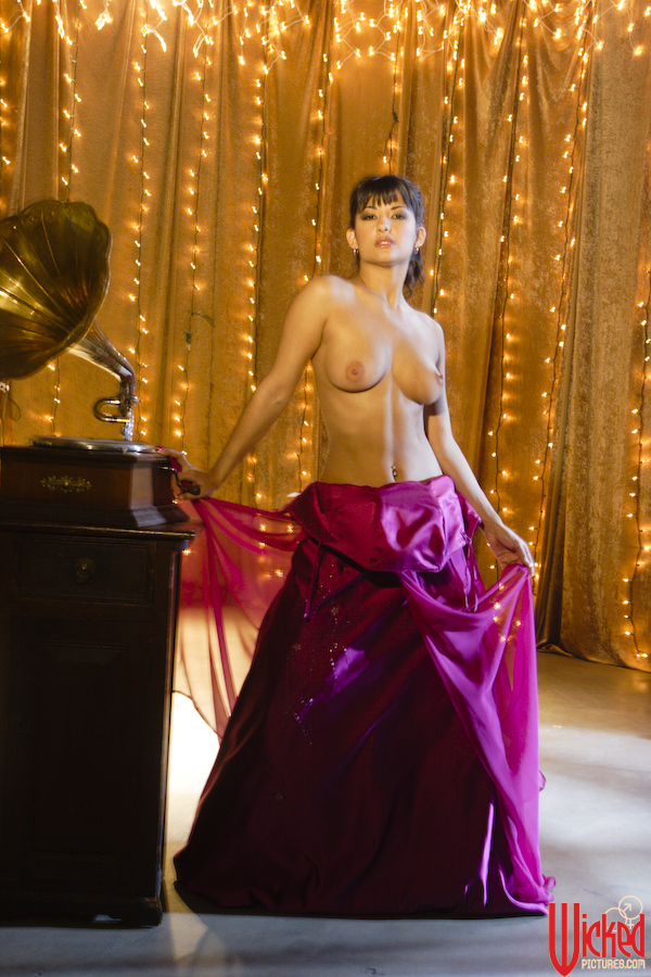 Carmen Hart posing in her purple dress, getting naked and showing her suckable tits.