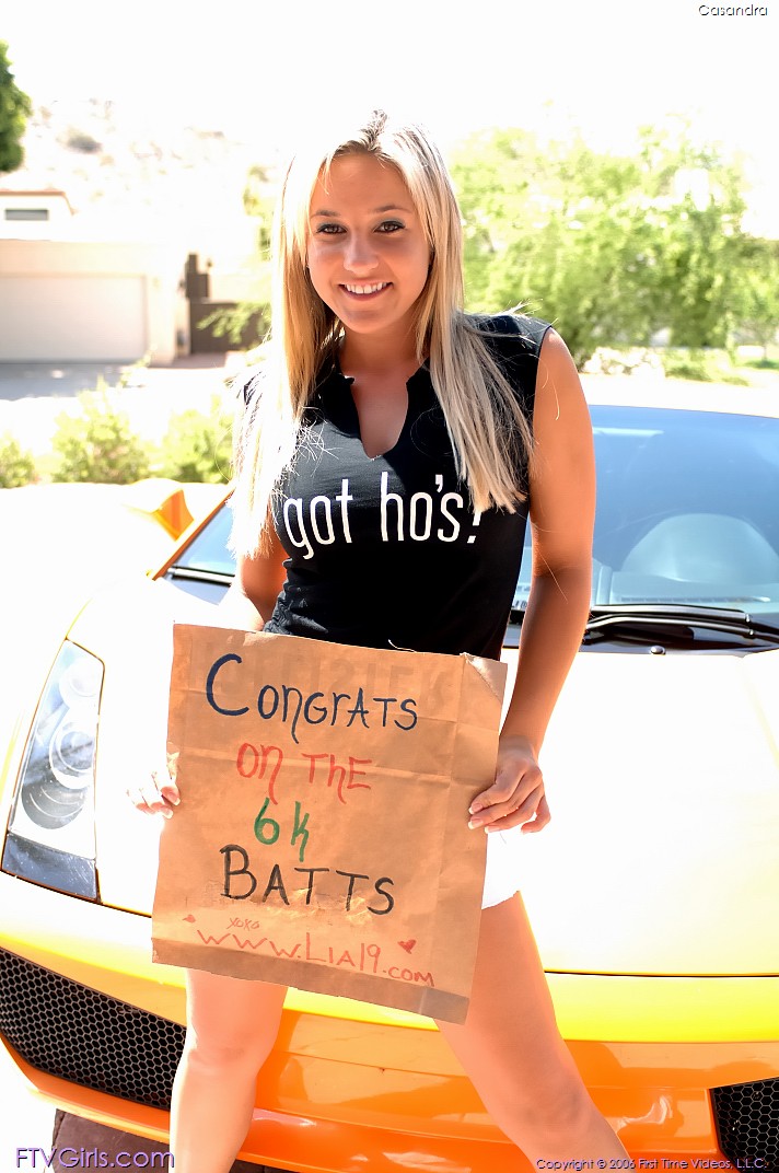 Horny and sexy babe Cassandra Cruz shows her big tits while posing with a supercar.