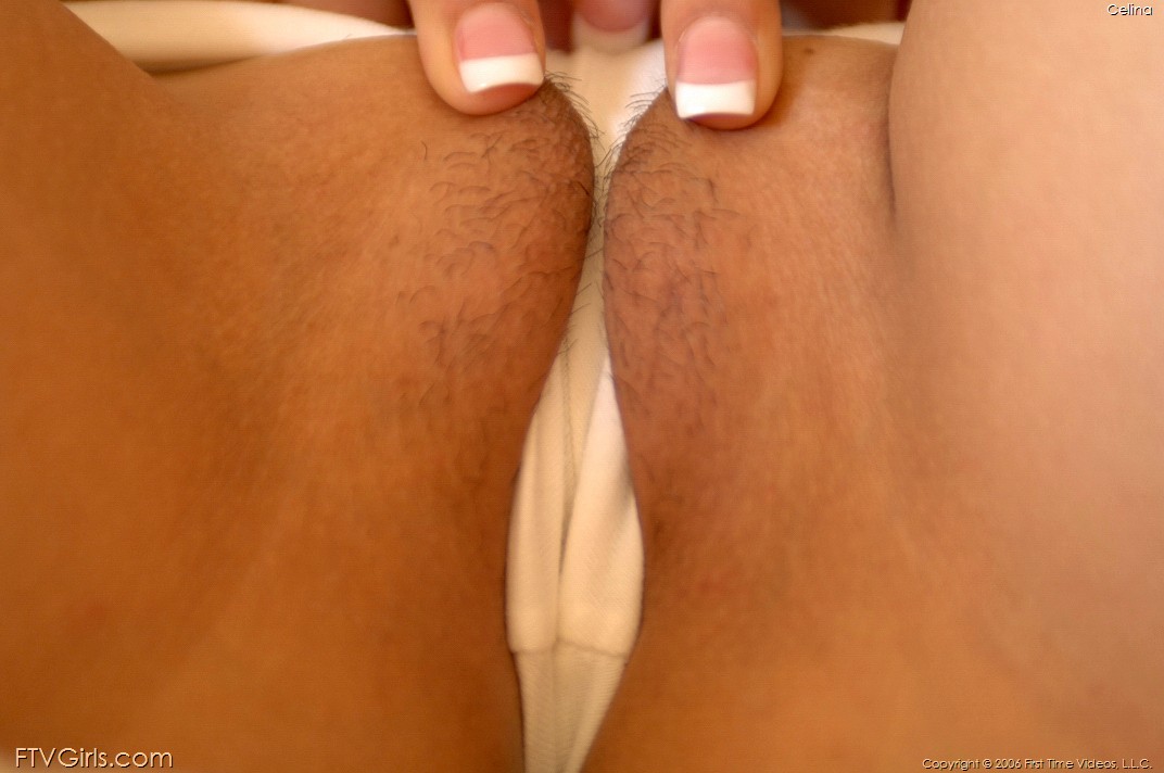 Cute solo brunatte babe Celina Cross posing on her bed and shows her hairy pussy.