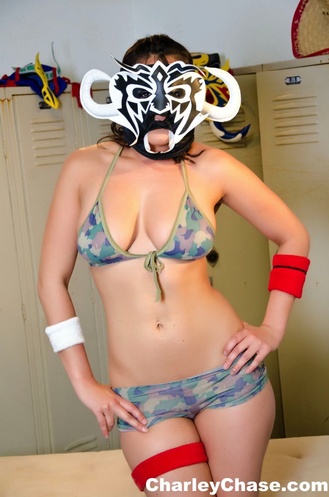 Kinky teen chick Charley Chase strips in the locker room and shows her cleveage.