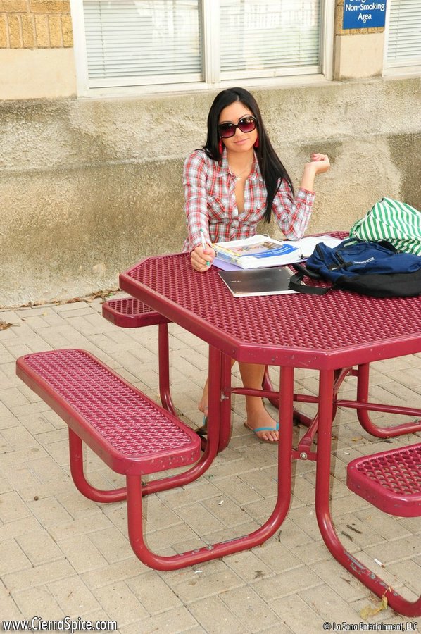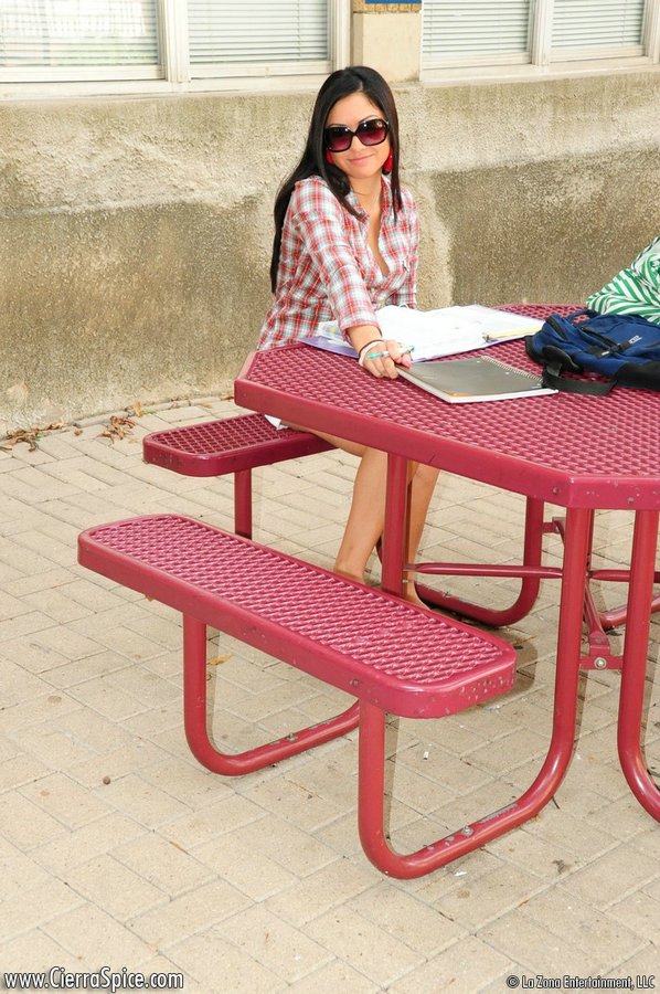 Attractive brunette Cierra Spice with sexy long legs posing in white short skirt.