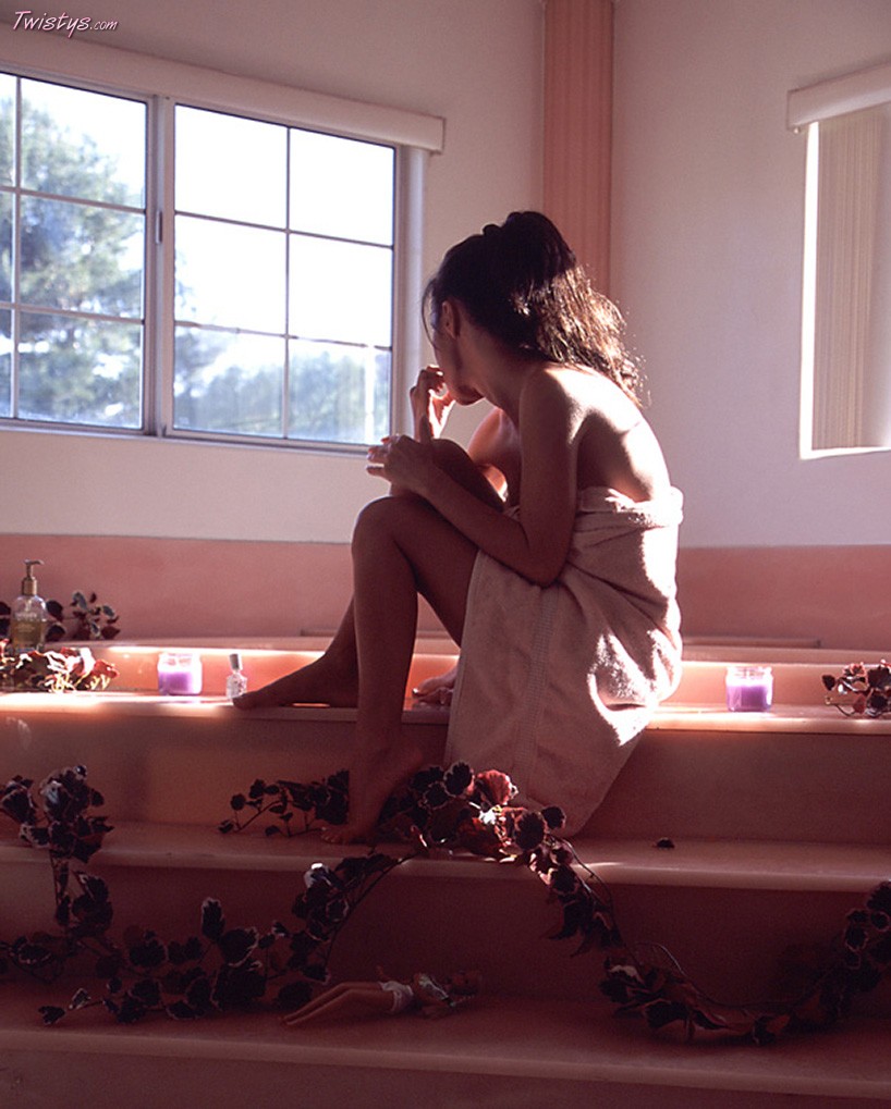 Seductive teen chick Crissy Moran strips her clothes and shows her round jugs.