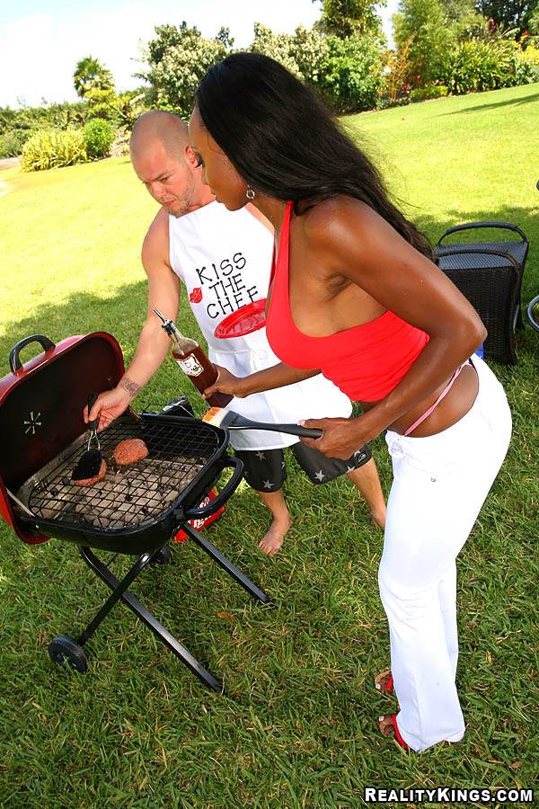 Horny ebony babe Diamond Jackson spreads her legs outdoors and gets nailed hard.