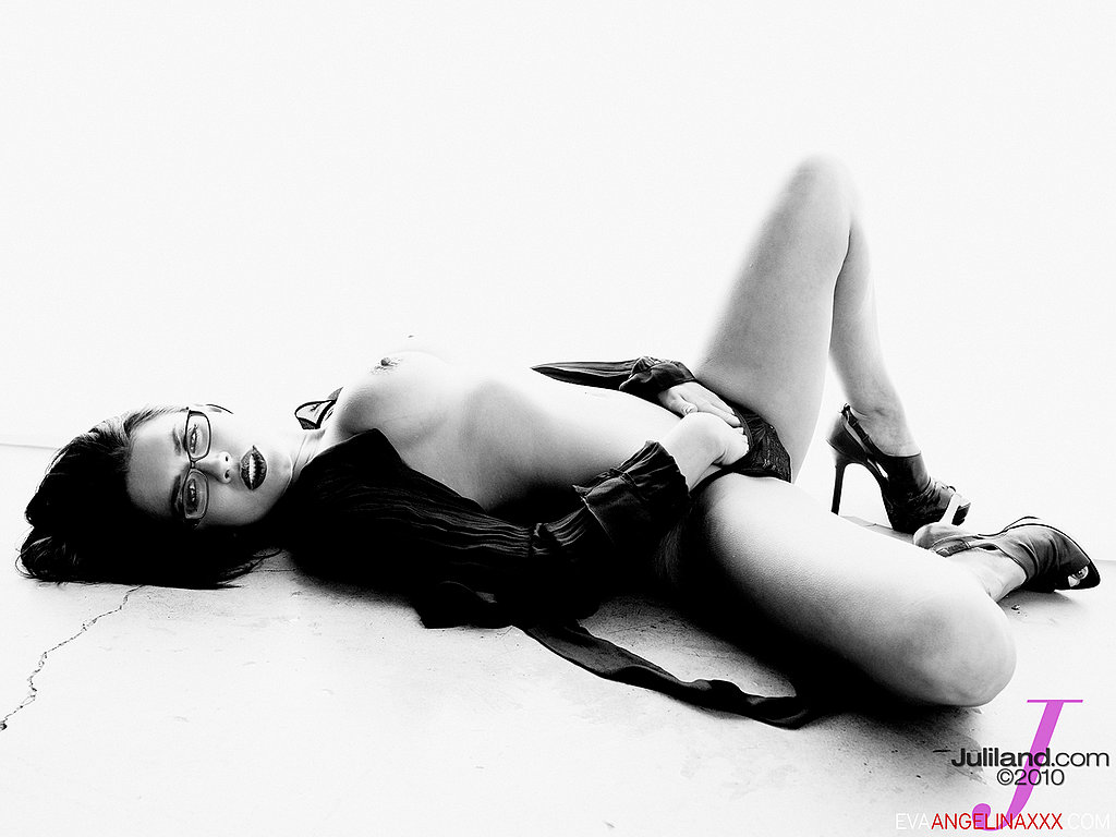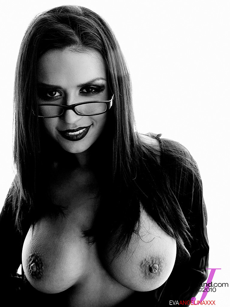 Big breasted brunette Eva Angelina takes off her jacket and shows her boobs.