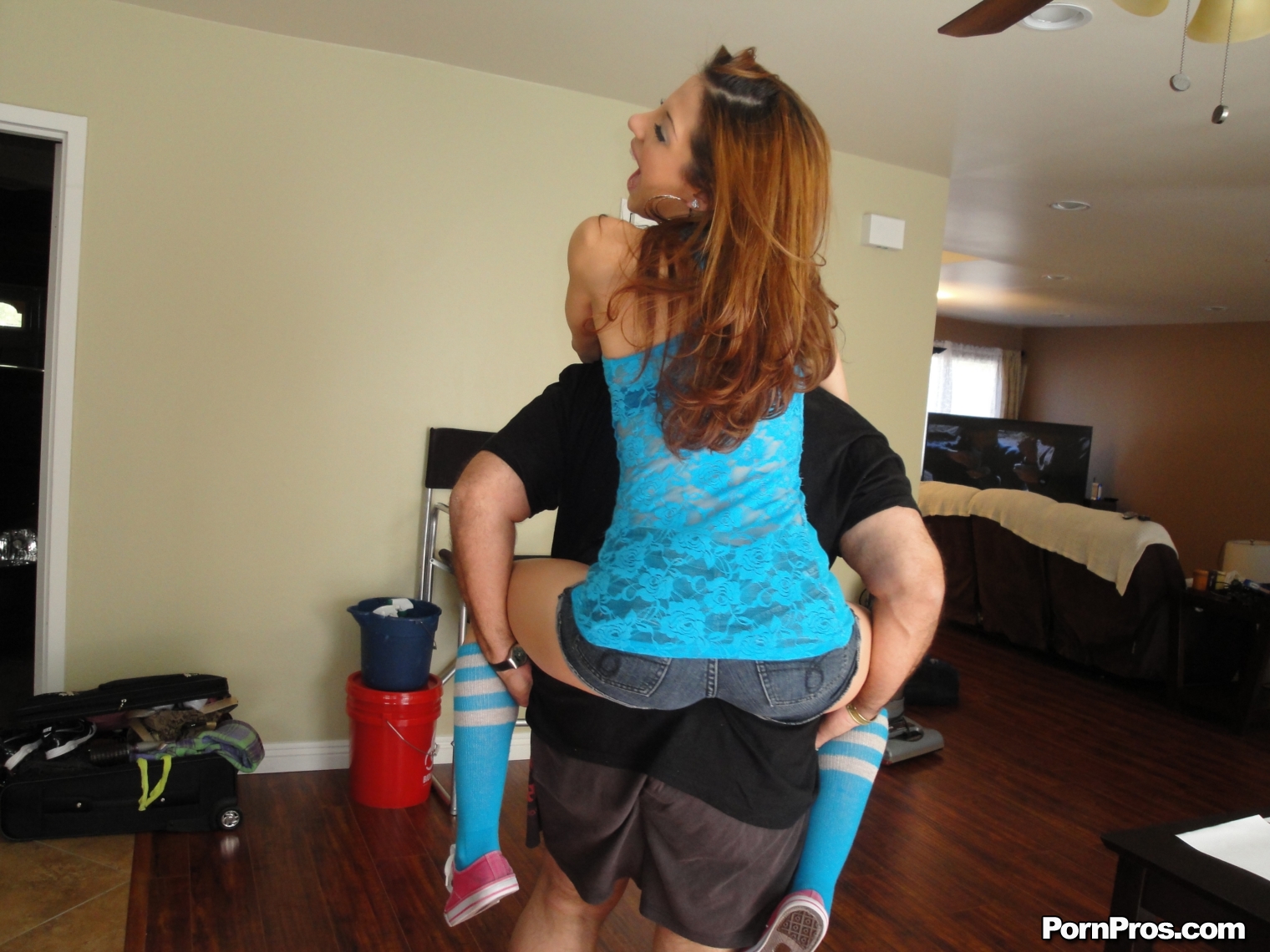 Ginger cutie takes clothes off while taking dick of her old lover into her holes from behind