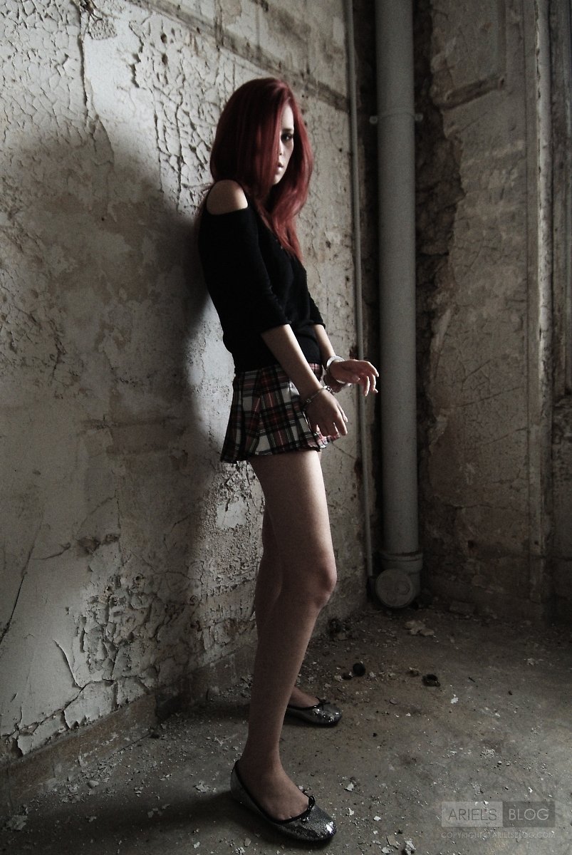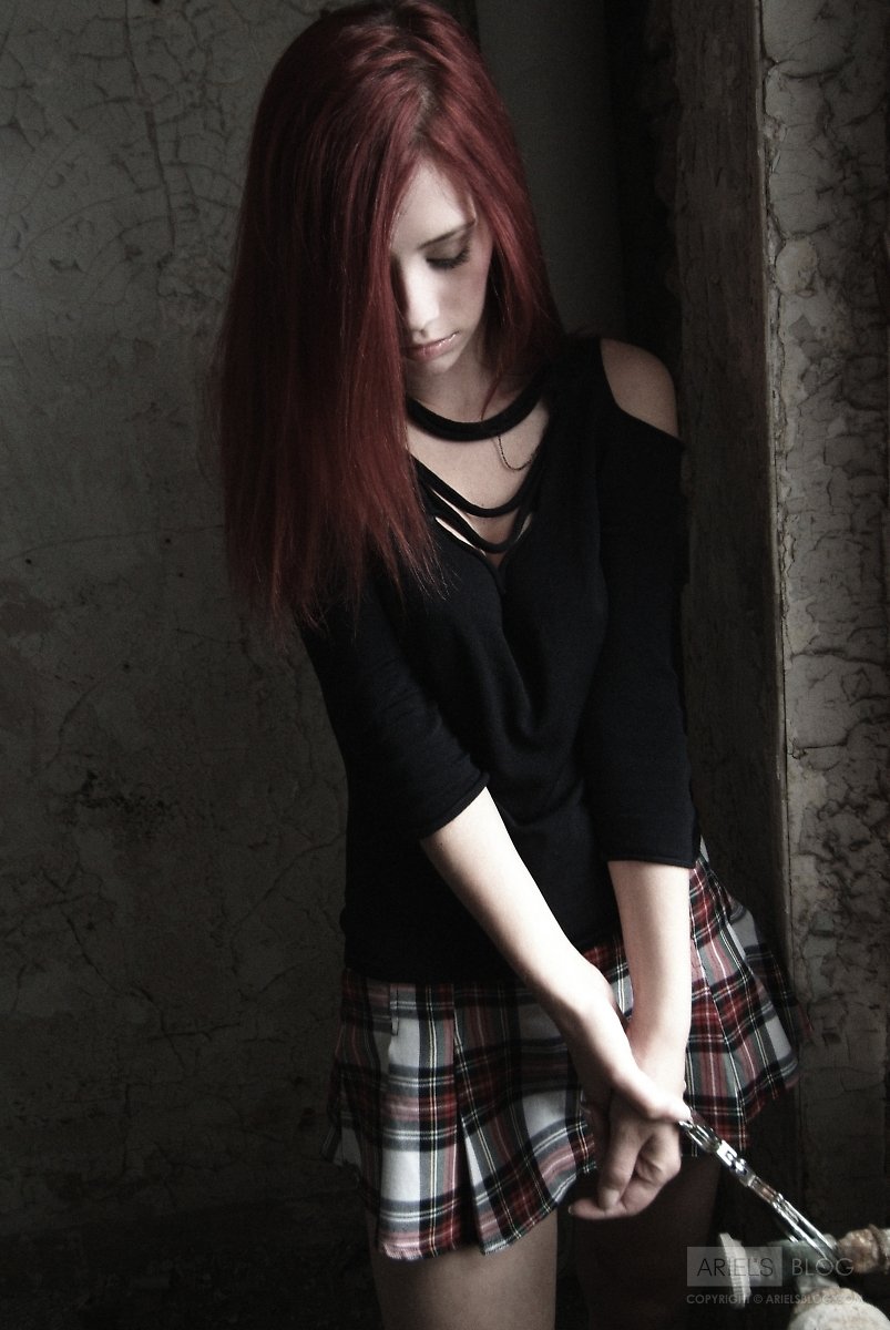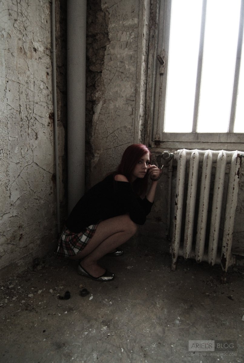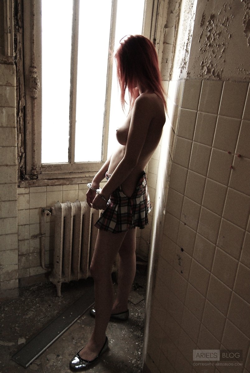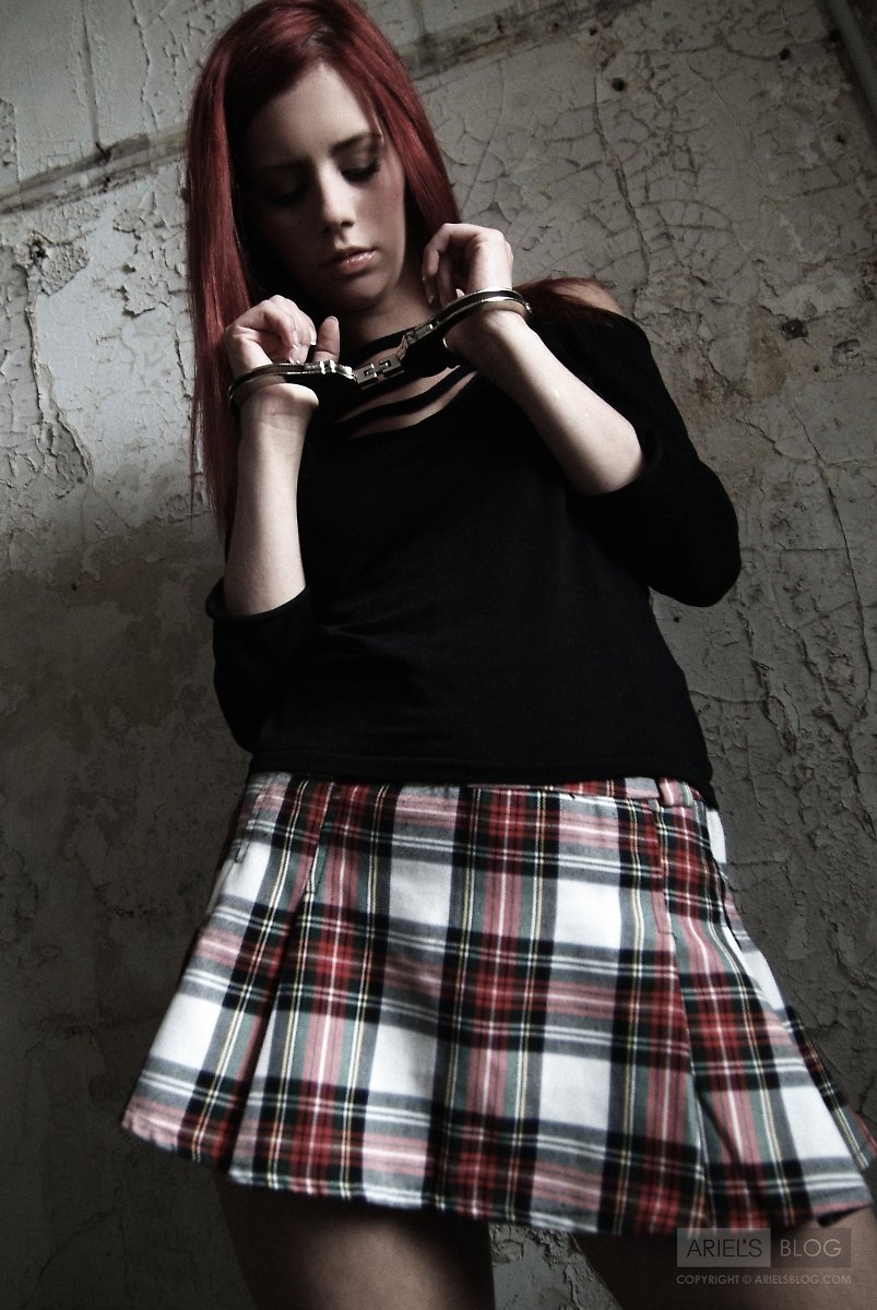Sexy redhead Gabrielle Lupin in short skirt handcuffed exposing big bazookas.