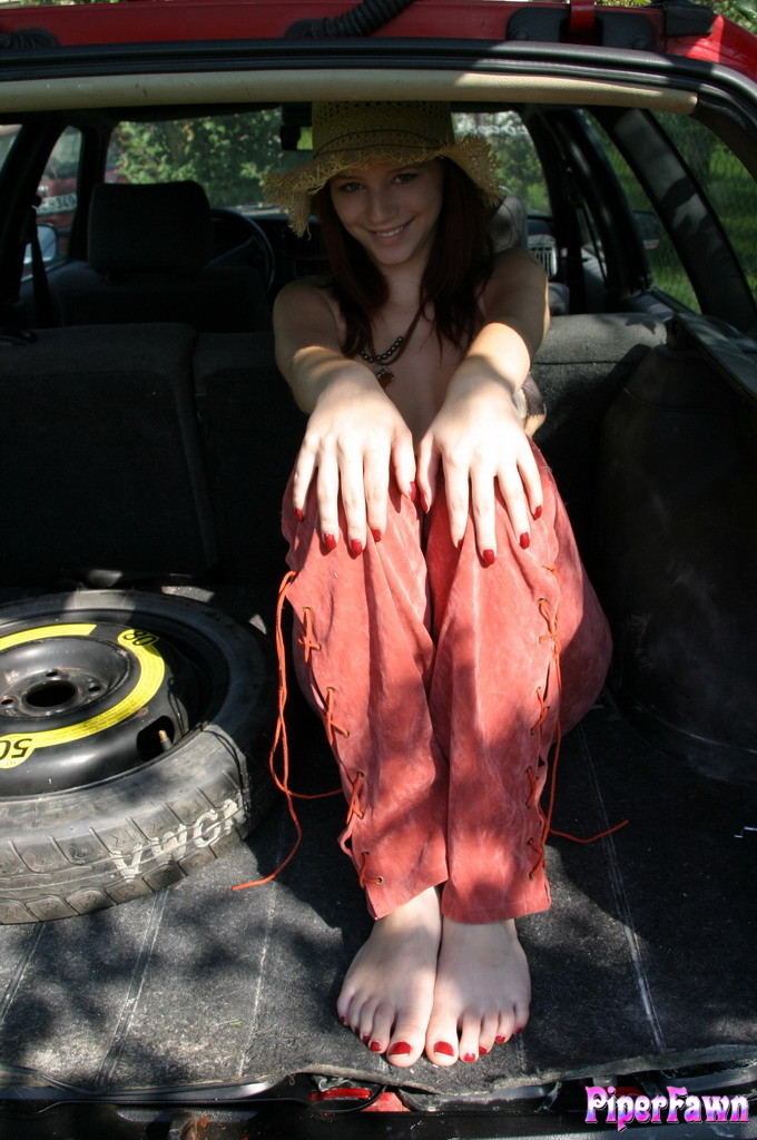 Sexy Gabrielle Lupin shows off her soft soles and toes in the trunk of her car.
