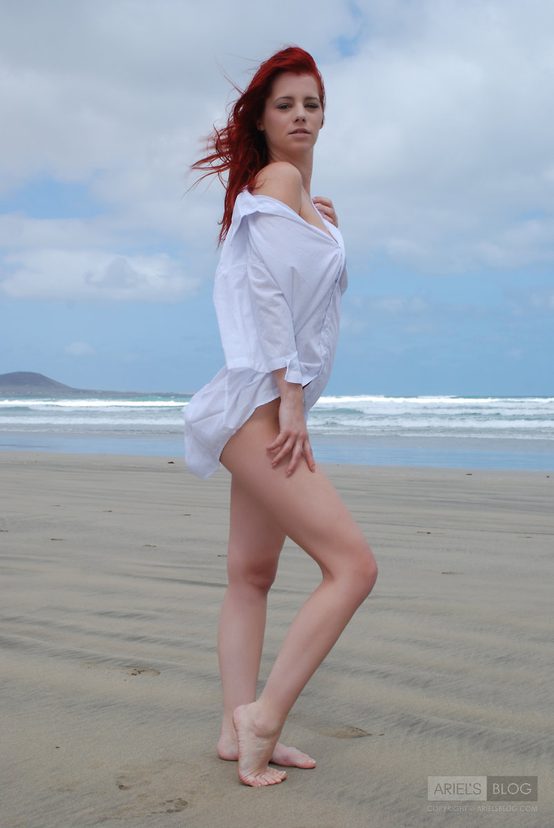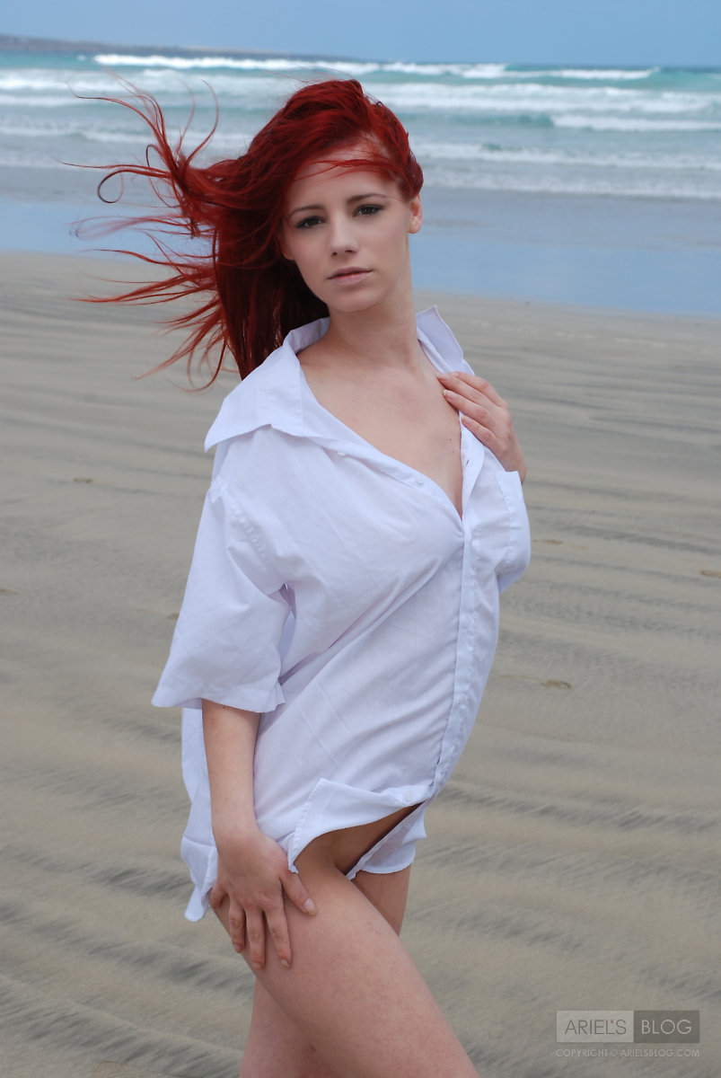 Seductive redhead beauty Gabrielle Lupin takes off her white shirt and shows cleveage.