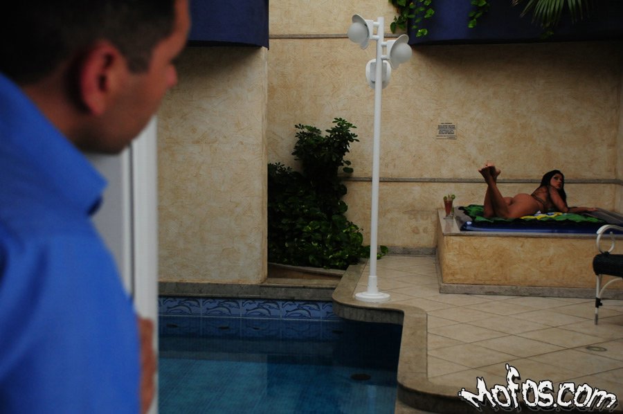 Gina Jolie takes her slutty bikini off by the pool and gets her tight muff screwed.