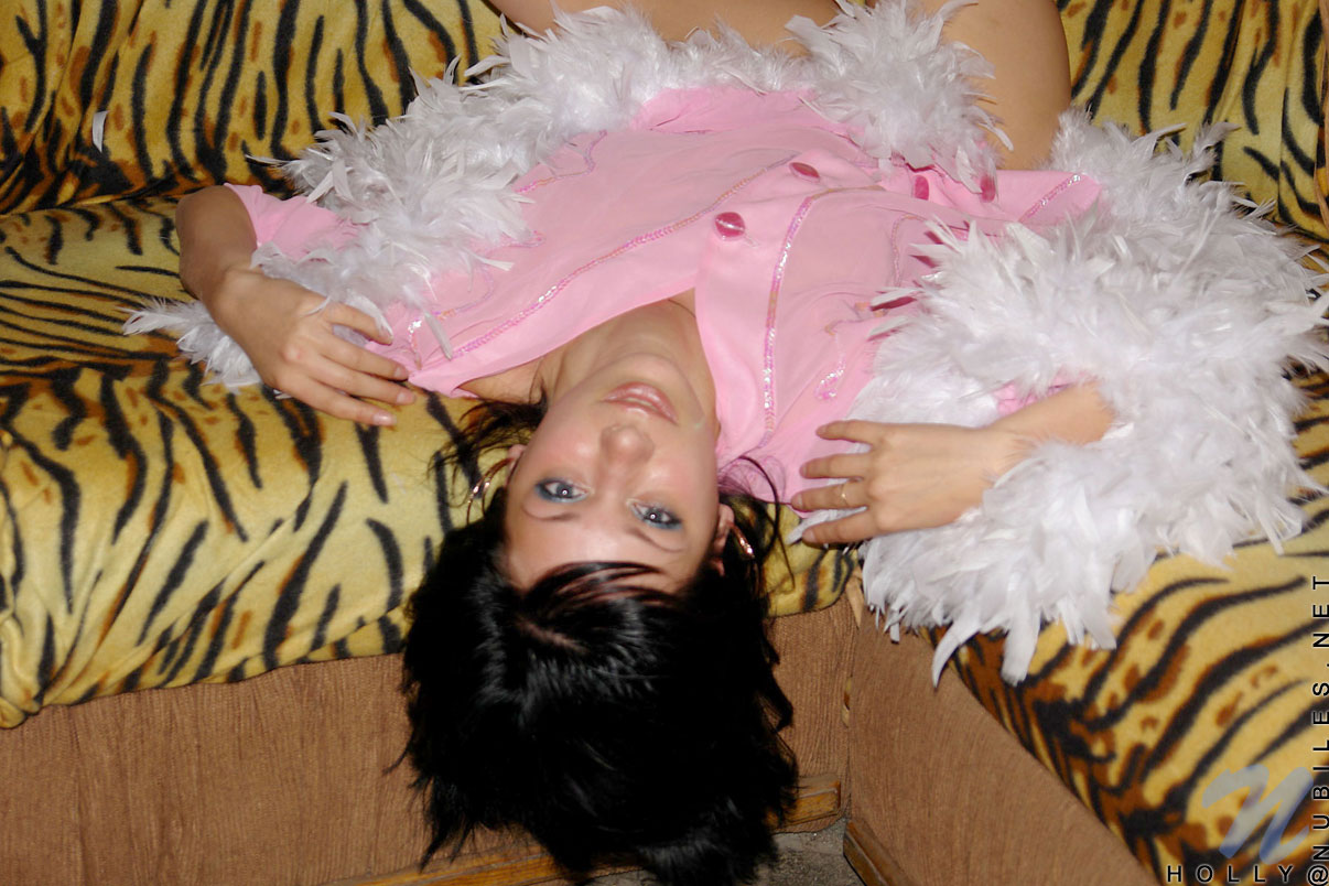 Brunette hottie lies down on the couch in a silk pink outfit and even caresses pussy till orgasm