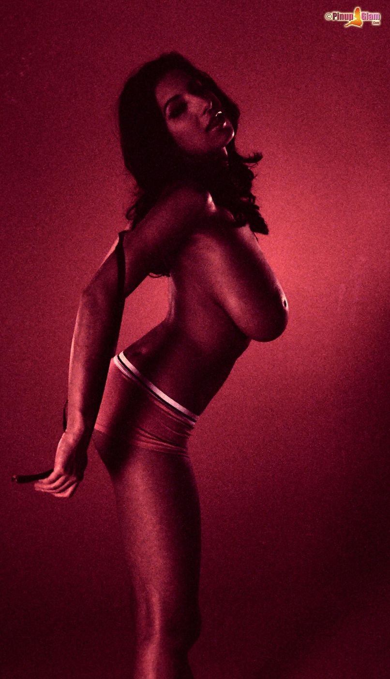 Hot brunette Jana Defi posing in black hot pants with her huge melons and a tie.