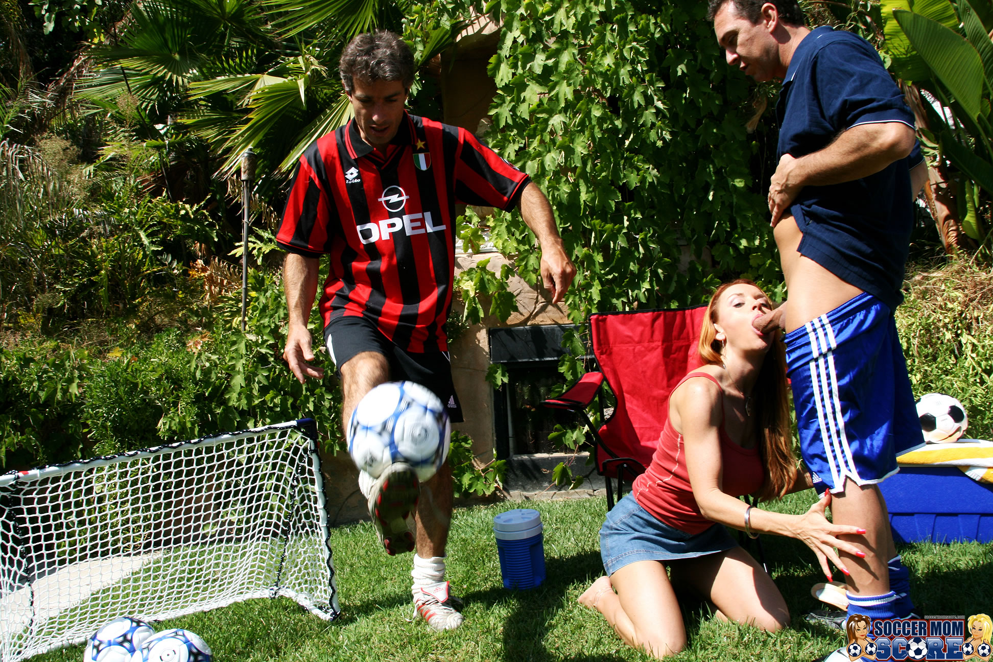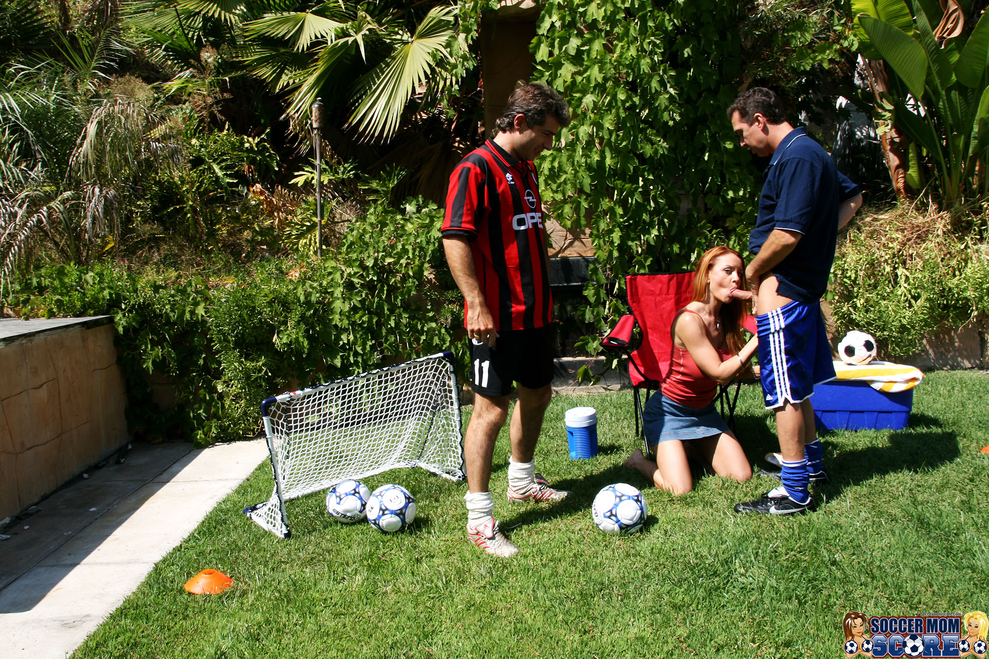 Foxy soccer mom Janet Mason strips her clothes and fucks with two hung studs.