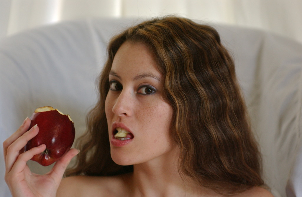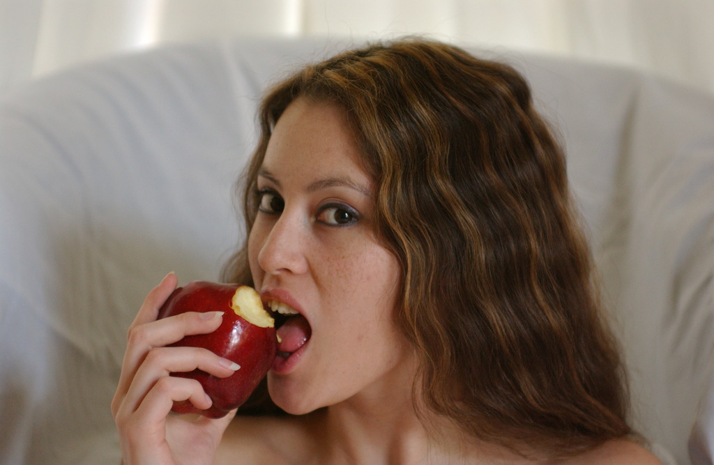 Jassie James takes her tight corset off on the sofa and shows her trimmed vagina.