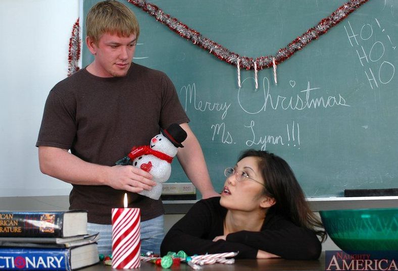 Hot asian brunette teacher Kaiya Lynn with nice tits geting Christmas sex present.