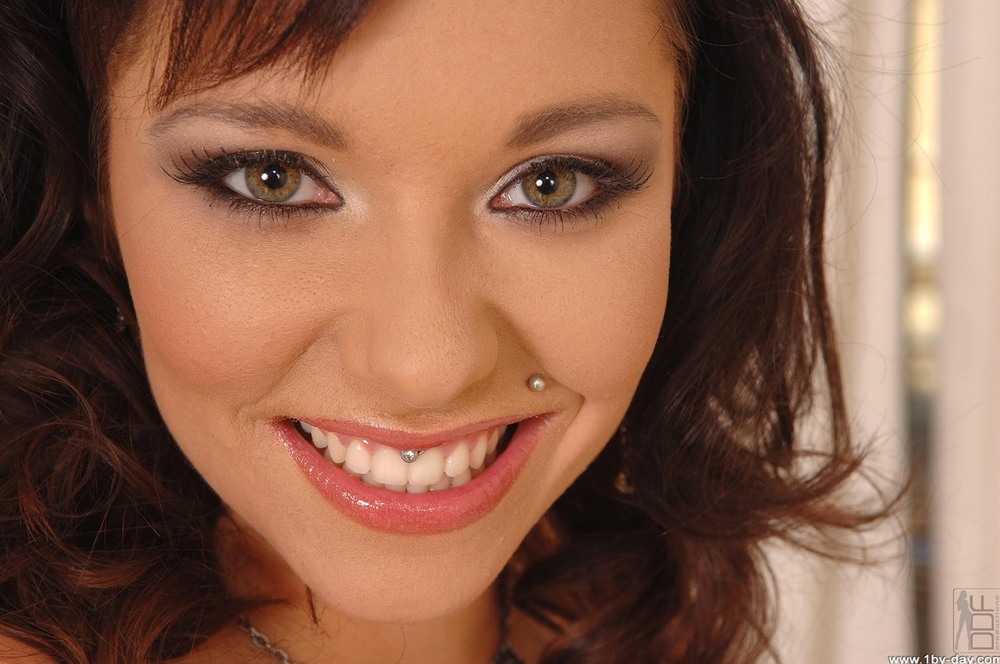Nasty tanned brunette Kami Nikita with nice tits fingering her shaved slippery cunny.