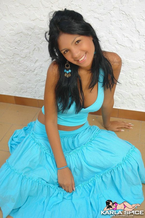 Naughty brunette Karla Spice showing big breastesses and hot ass in blue thong.