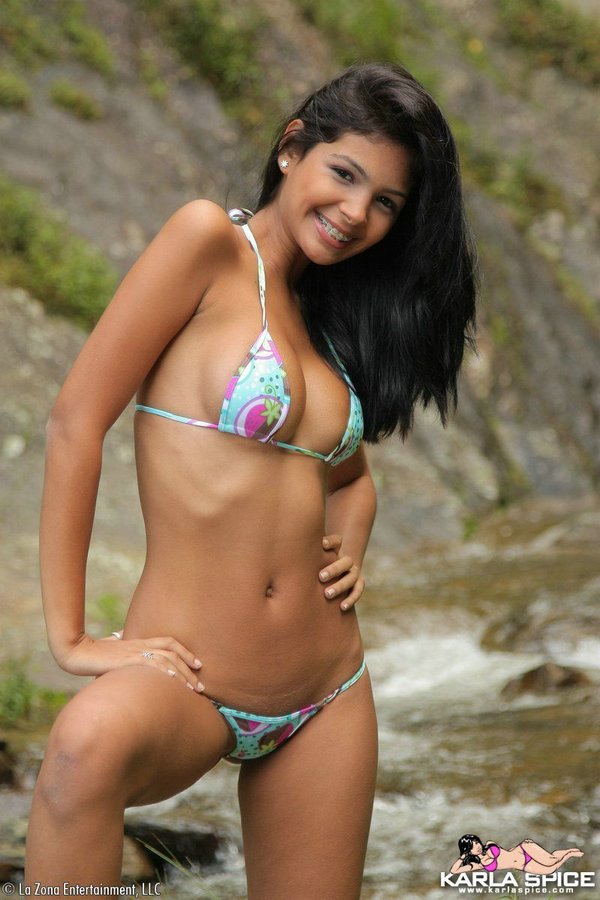 Amazing brunette with hot tanned body and great tits Karla Spice posing topless.