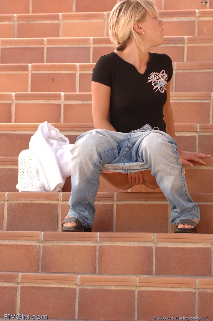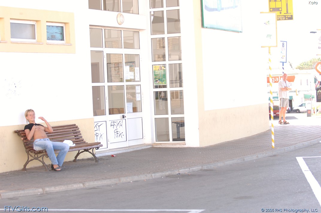 Katerina Peskova pulls up her cute black shirt and shows her tiny tits on a bench.