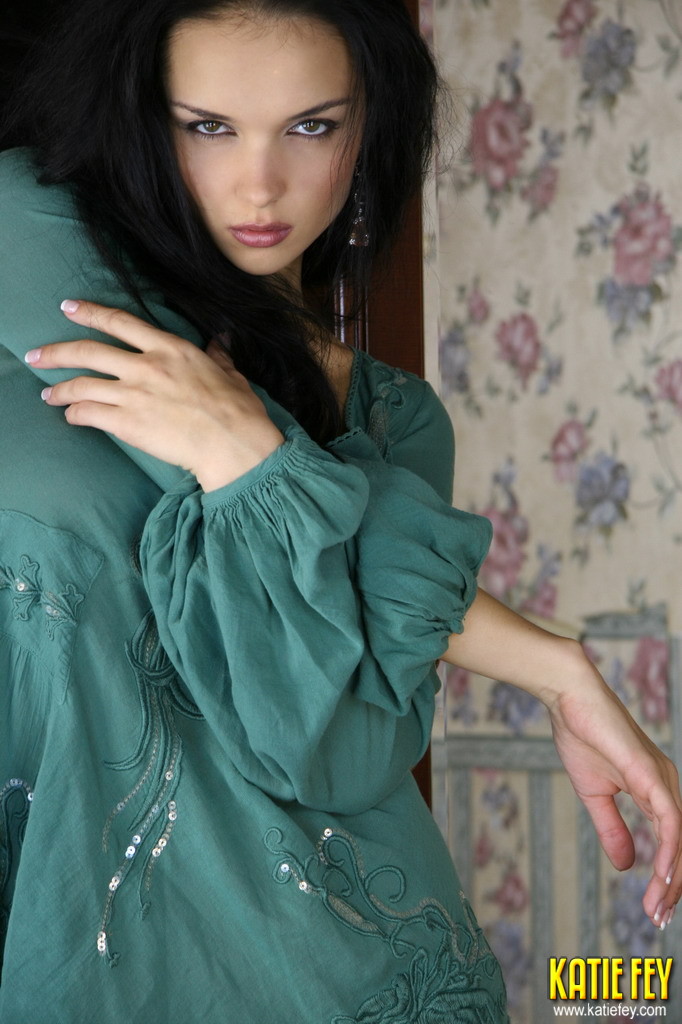 Beautiful and sexy brunette Katie Fey takes off her dress and shows her melons.