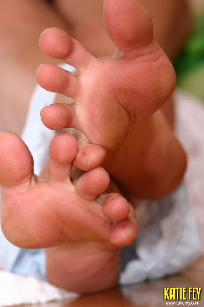 Hot brunette teen gal Katie Fey takes off her white thongs and shows her hot pussy.