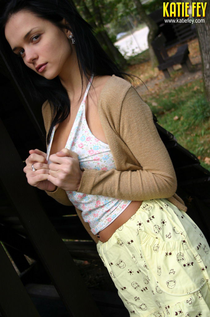 Cute and seductive brunette Katie Fey takes off her white shirt and shows her rack.